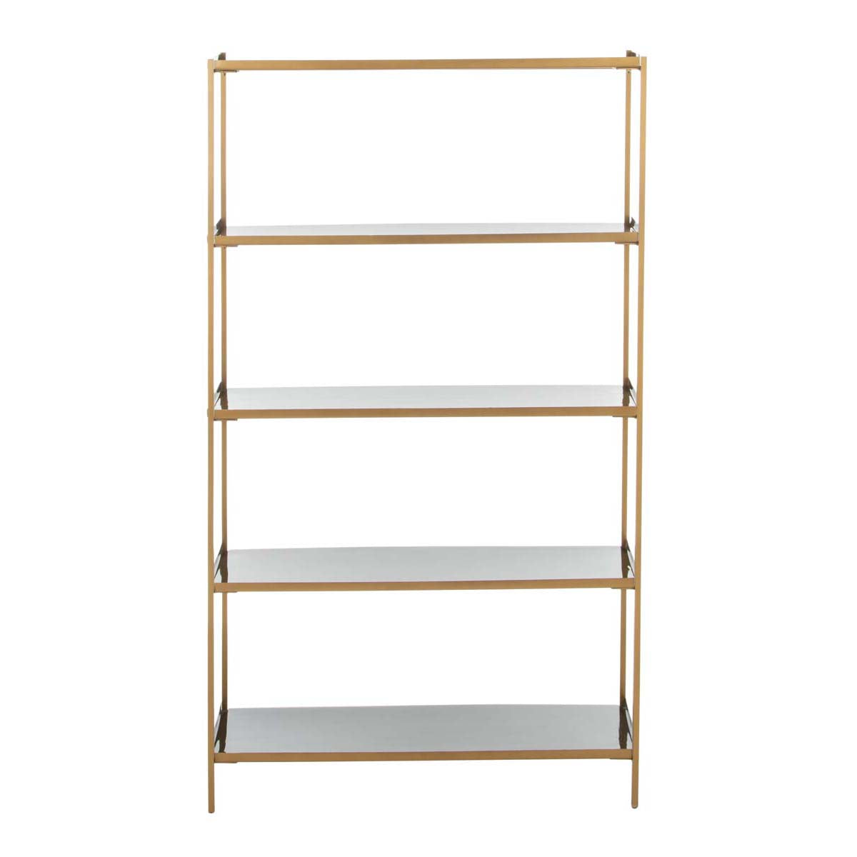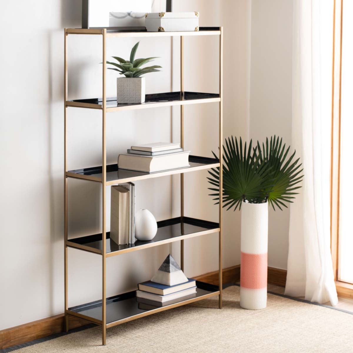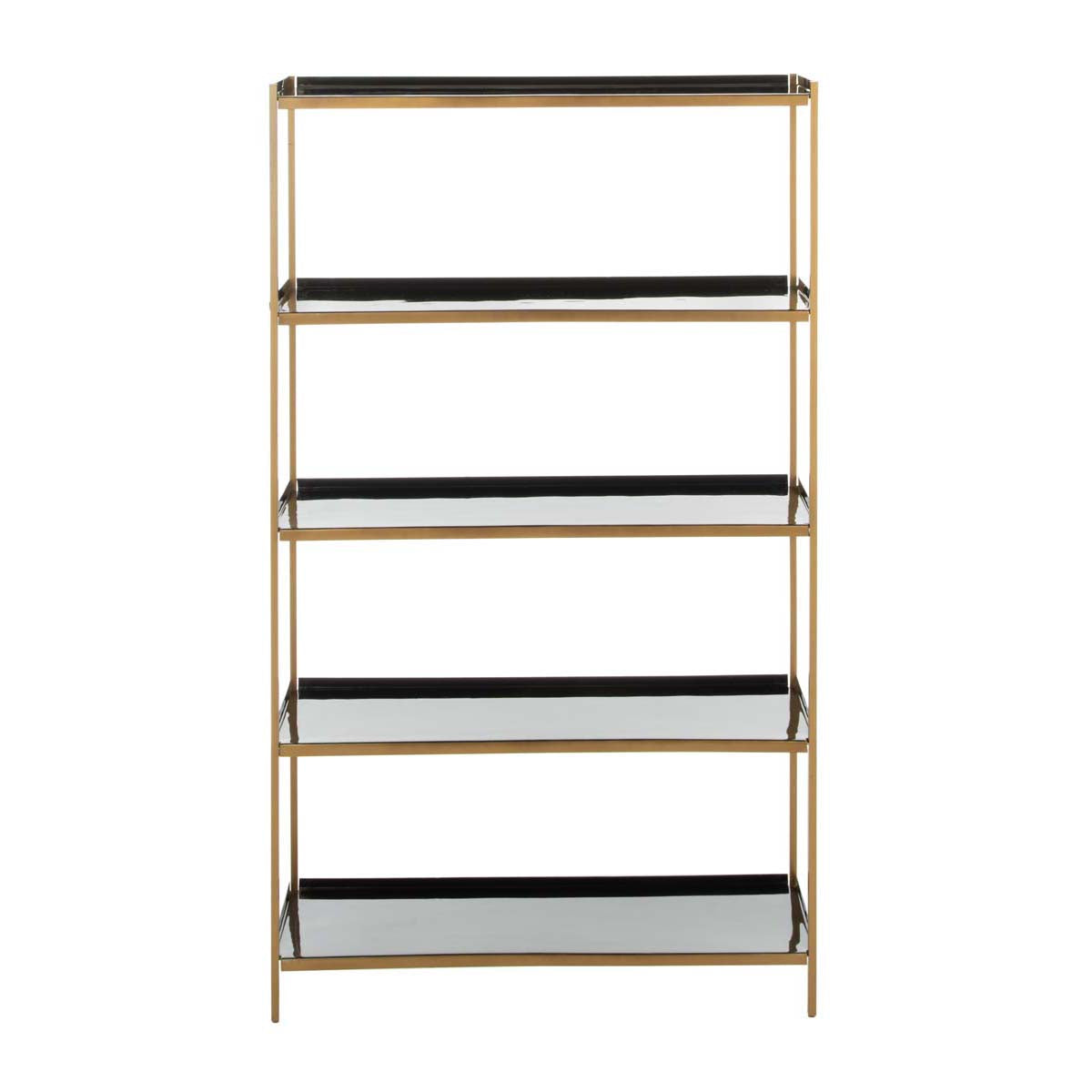 Tall, dark and handsome, this dramatic 5 tier ?tag?re brings modern luxury to the living room. Its statuesque form was designed to blend style and substance with its sophisticated black shelves, sleek brass finish and generous layers of open storage.