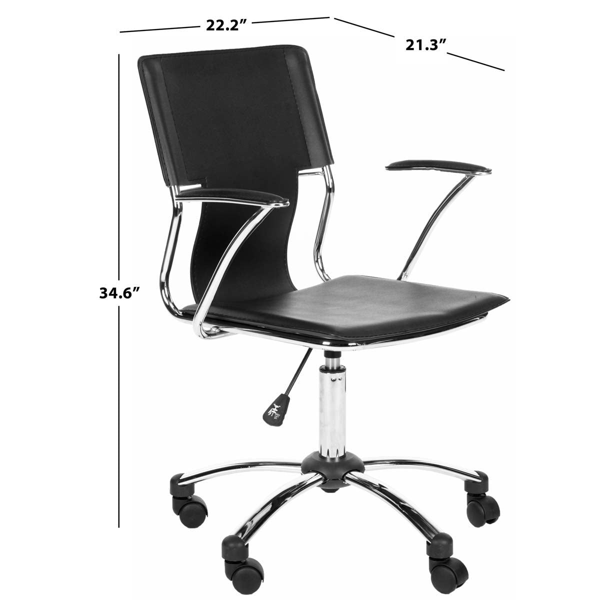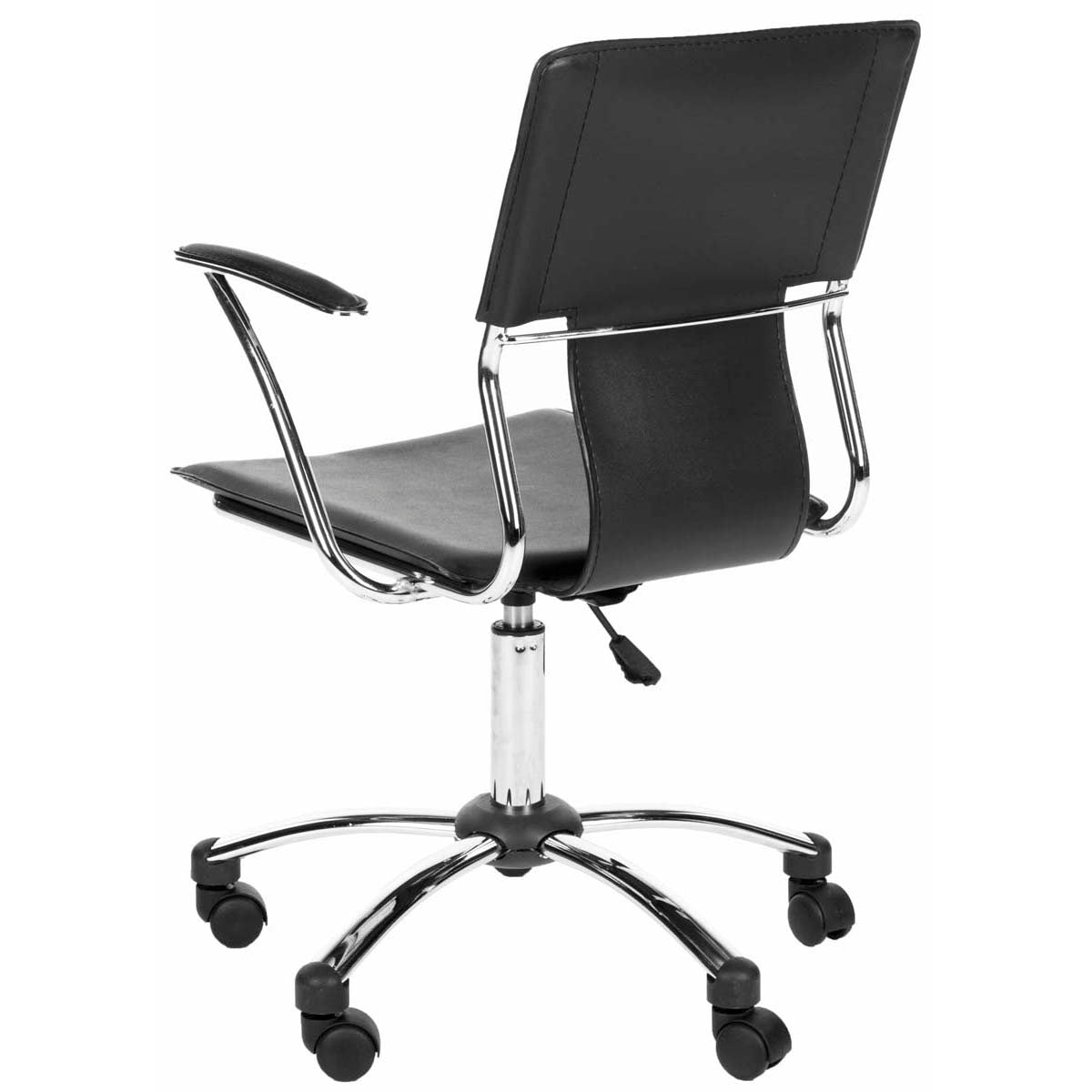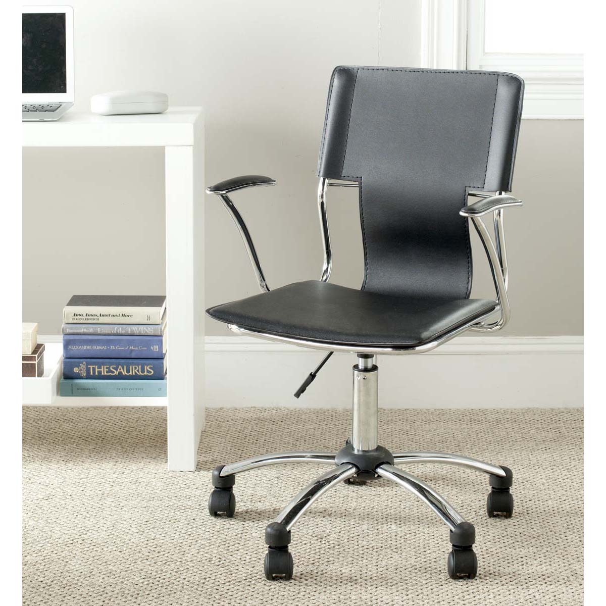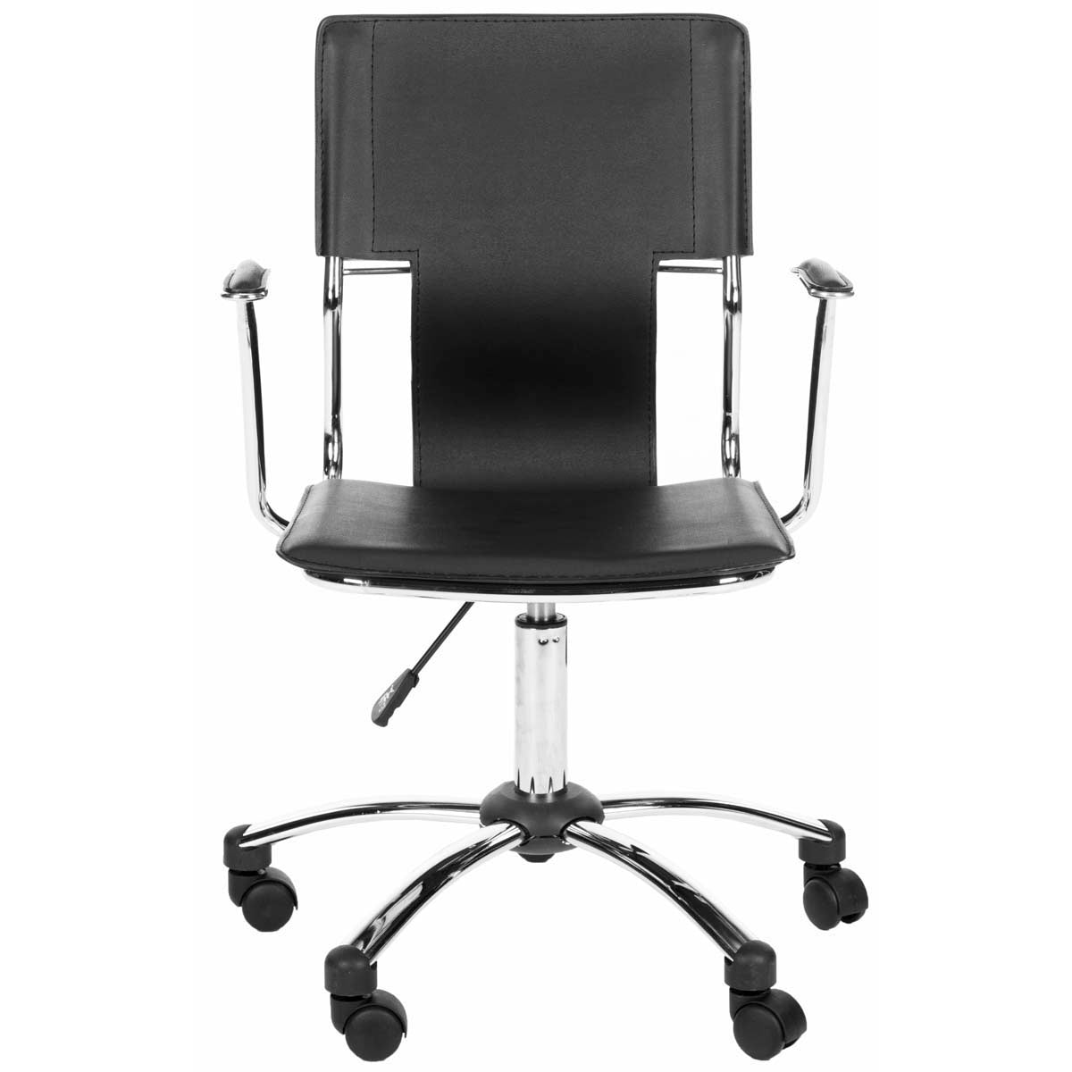 The adjustable Kyler Desk Chair is a posh postmodern spin on the modern office chair. Crafted with metal frame, rubber wheels and black PVC leather, its spare lines and graphic form bring the right angle to any meeting.