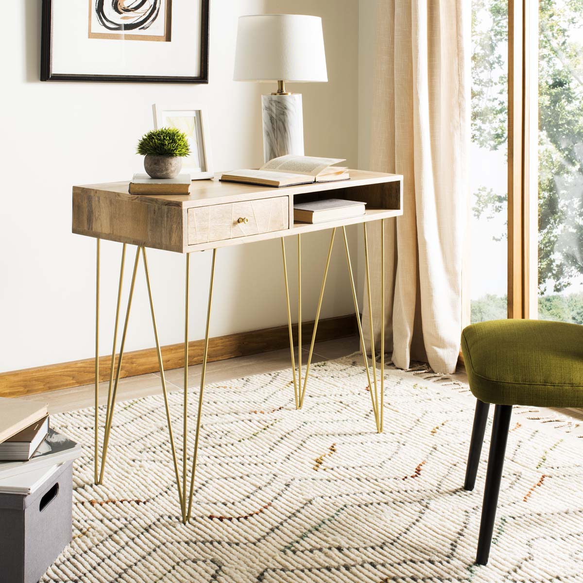 Elevate the home office to new heights of decorative drama with this Marigold Desk. Featuring sleek brass hairpin legs that beautifully pair with the matching inlay and pull on its drawer, Marigold's artful asymmetry and retro inspiration give any interior a chic, glamorous touch.