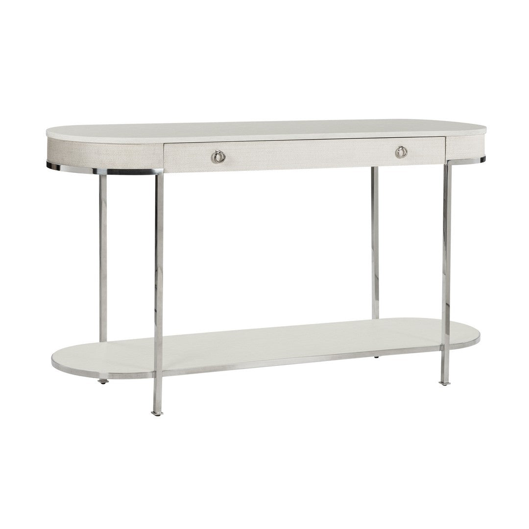 Our Bay Harbor Console Table features a smooth top, shelving, one storage drawer, a raffia detail, and a polished silver base and legs.