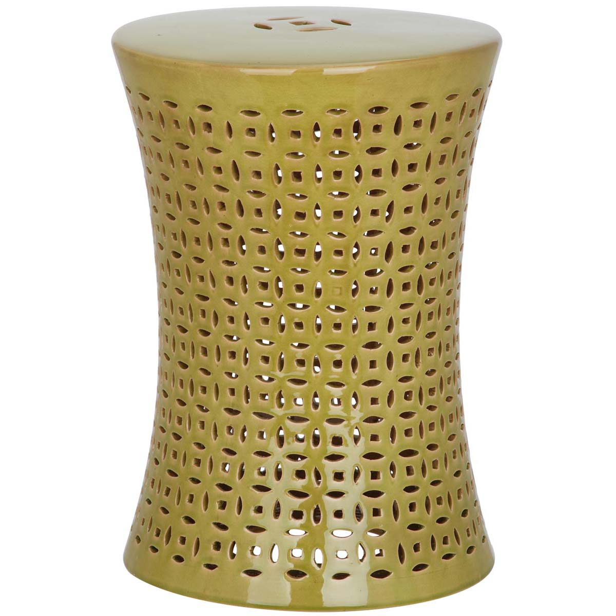A graceful hourglass silhouette updates a zen garden classic in this Camilla Garden Stool. Crafted of spring green ceramic with an allover pierced design of ancient Chinese lucky coins, Camilla is engaging and beautiful both indoors and out.