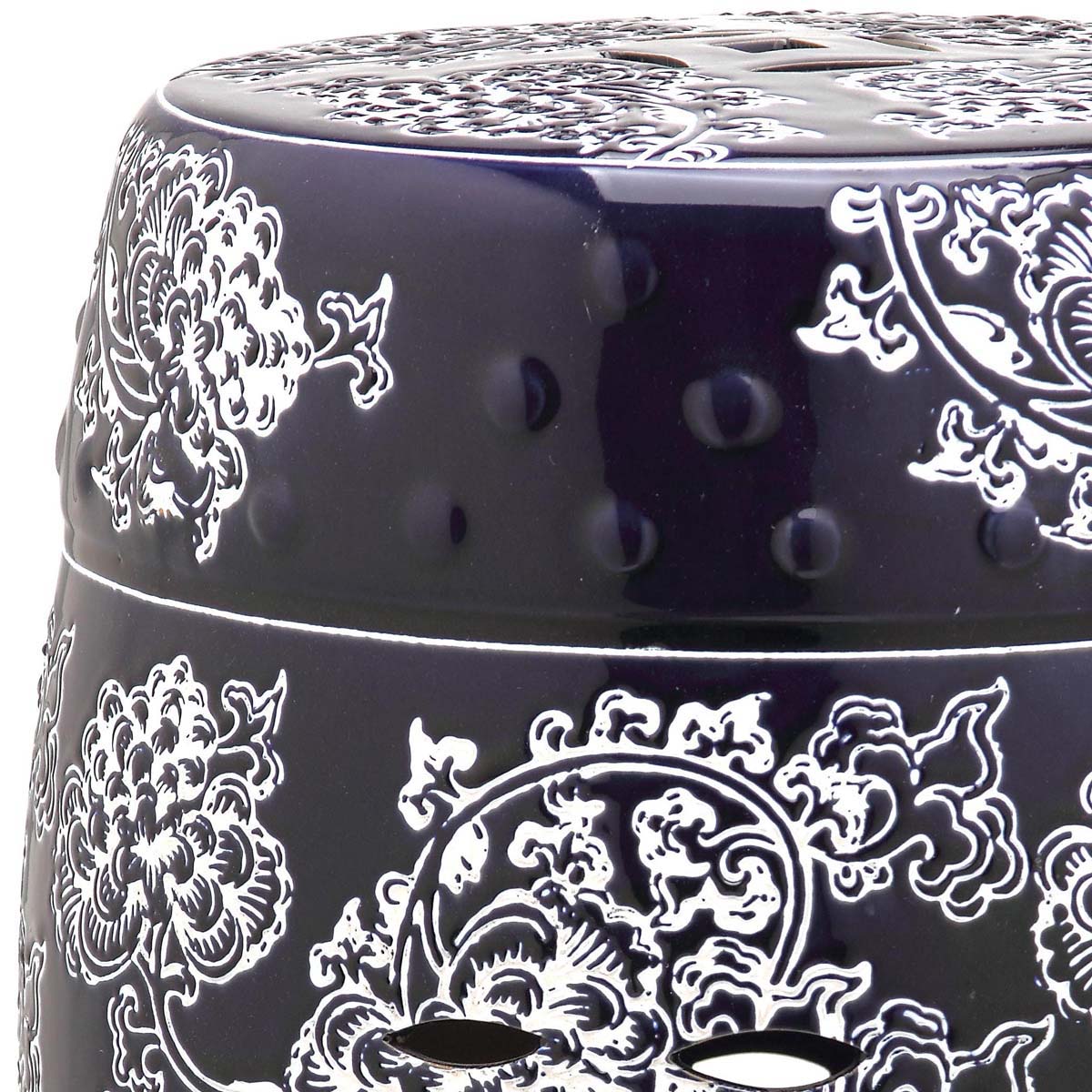 Reminiscent of Asian inspired British crewel fabric motifs, the pattern adorning the Midnight Flower Indoor Outdoor Garden stool is a traditional classic. The striking navy and white glazed ceramic make it perfect as a designer's finishing touch to any decor.
