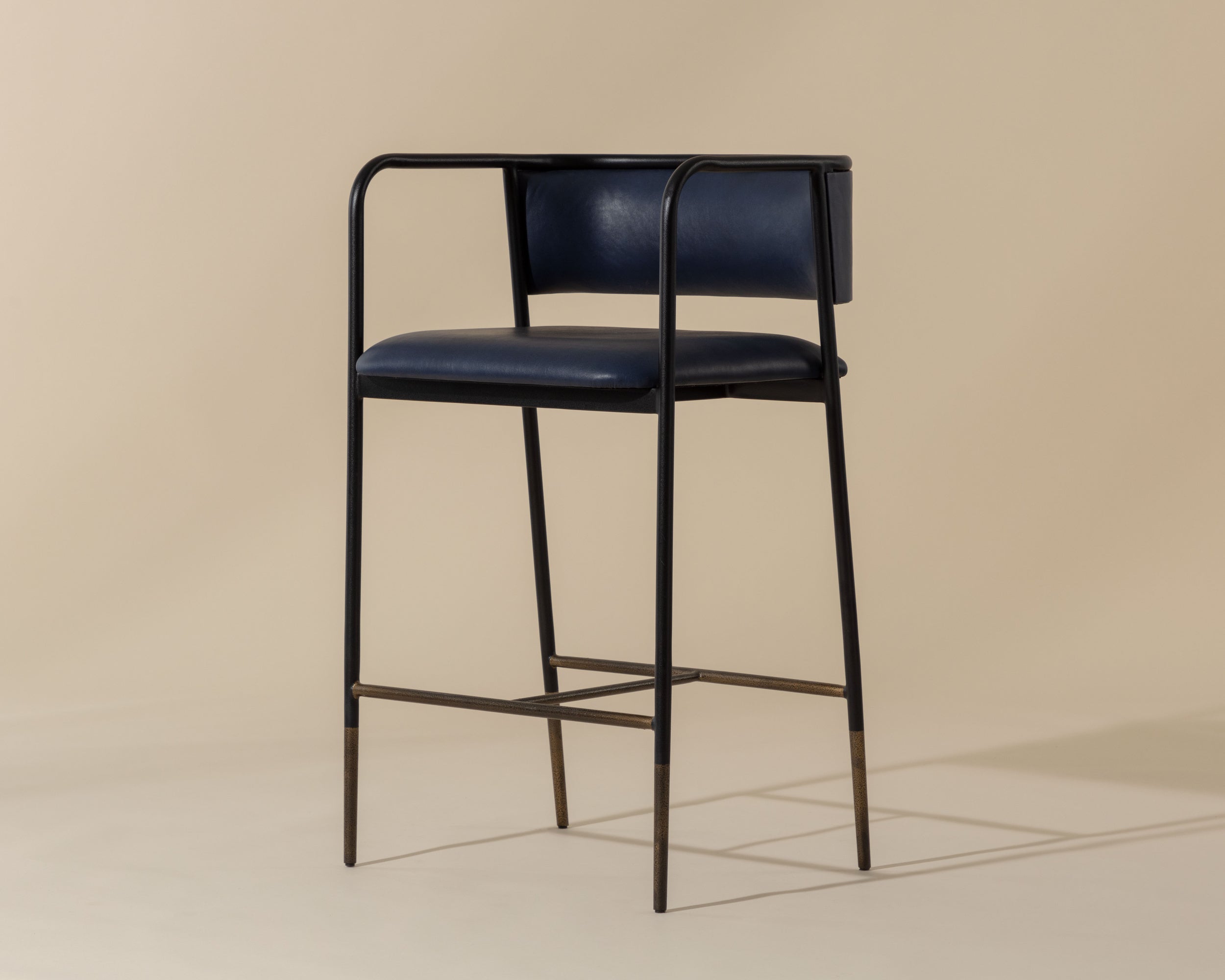 Simplicity is key with this effortlessly elegant counter stool that features a curved backrest. Stocked in bravo admiral faux leather and completed with a black metal frame and legs with antique brass foot caps. Made in India. With refined craftsmanship, this design was brought to life by skilled local artisans. By nature, these materials develop unique imperfections such as fissures, markings and colour variations for a truly one-of-a-kind piece. Handle With Care: This design has been crafted with faux leather. Faux leather is manufactured to reflect the natural characteristics of leather; as such, colour variations, markings wrinkles, grooves, and light scratches are appreciated characteristics. No two pieces will be alike. Visit our Product Care page for more information on how to ensure the lasting beauty of this piece.
