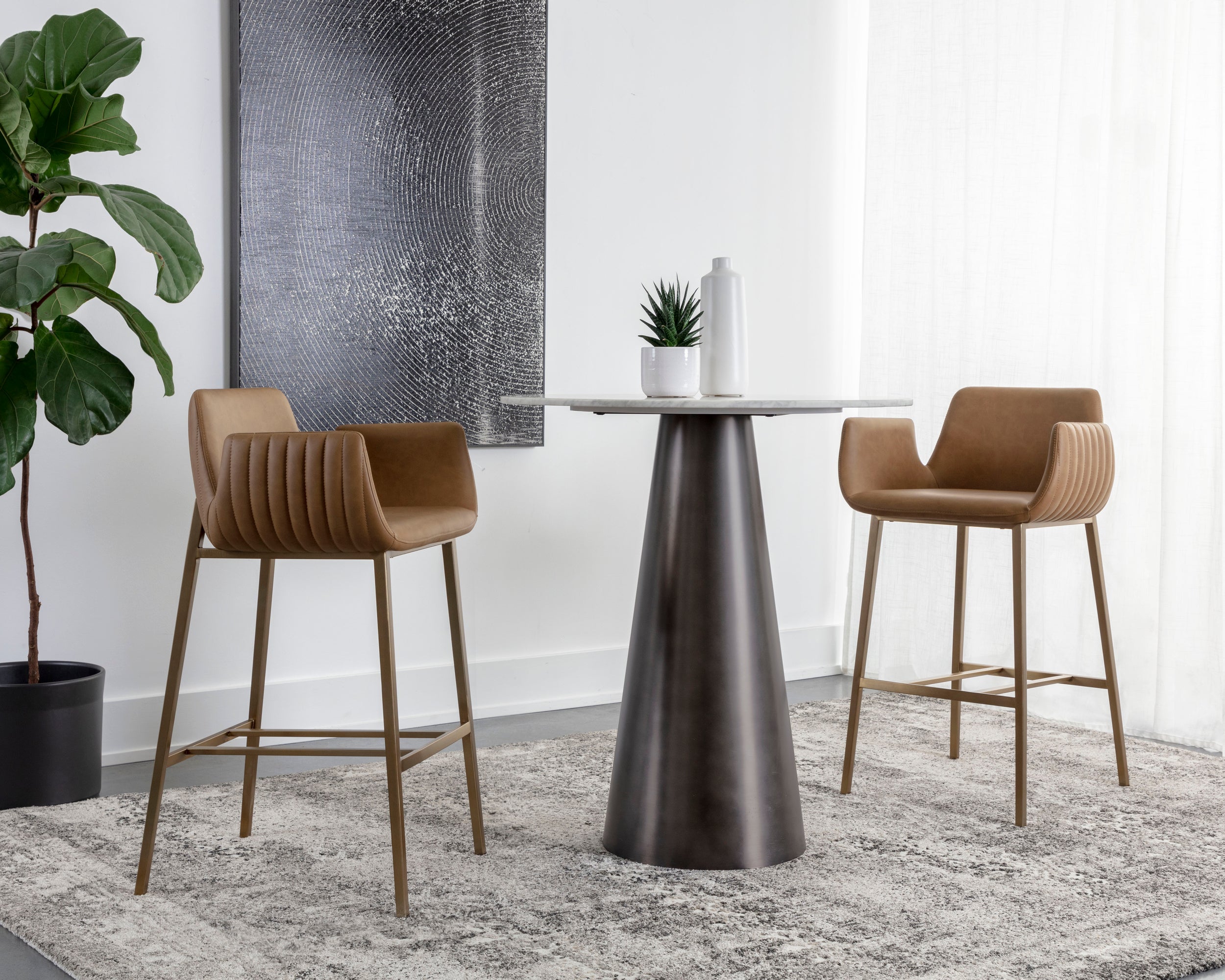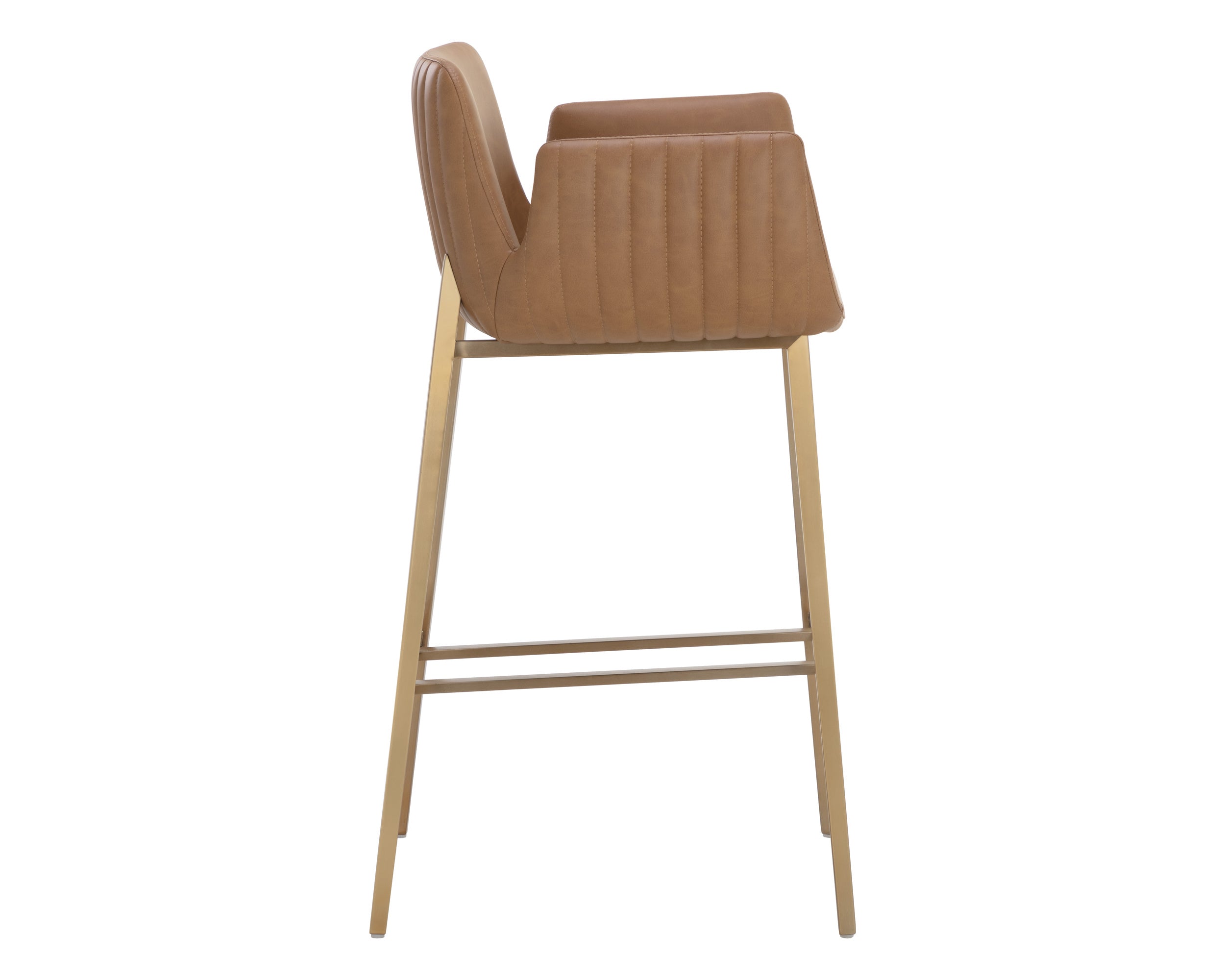 With its stunning scooped design, the Lucano Barstool is an impressive addition to any dining space. Features vertical channel tufting on exterior seat. Stocked in smooth milliken cognac faux leather and completed with gold stainless steel legs. Handle With Care: This design has been crafted with faux leather. Faux leather is manufactured to reflect the natural characteristics of leather; as such, colour variations, markings, wrinkles, grooves, and light scratches are appreciated characteristics. No two pieces will be alike. Visit our Product Care page for more information on how to ensure the lasting beauty of this piece.