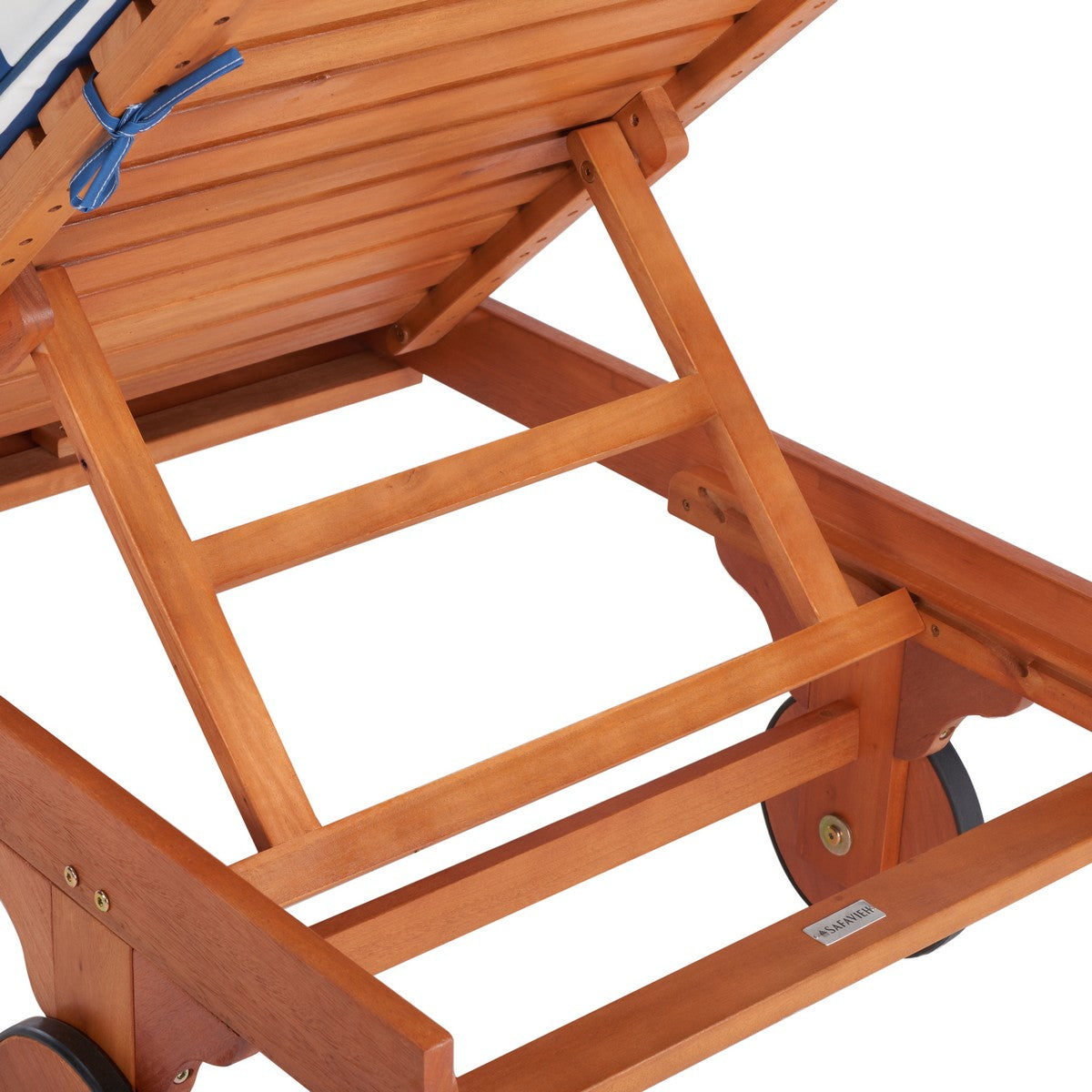 A fresh update of an English garden classic, the Newport Outdoor Lounge Chair recalls the manicured landscapes of Rhode Island seaside mansions. Newport is crafted with striped blue fabric and naturally finished eucalyptus wood with back wheels for easy mobility and a sliding table for drinks.