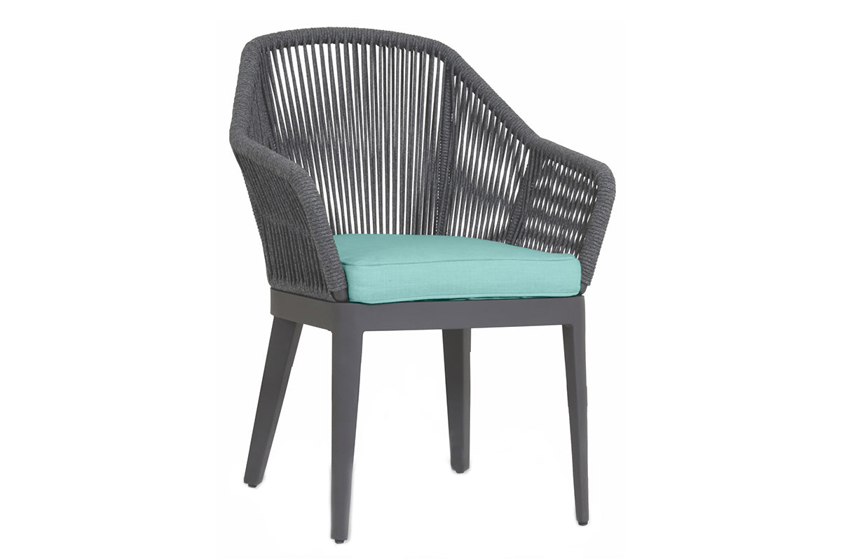 Crafted in the highest quality comfort and durability, the Milano Dining Chair will stand the test of time with minimal maintenance. Its curved powder coated aluminum frame is expertly wrapped with premium all-weather olefin rope in a charcoal-grey finish, and is finished with a slate tapered leg.