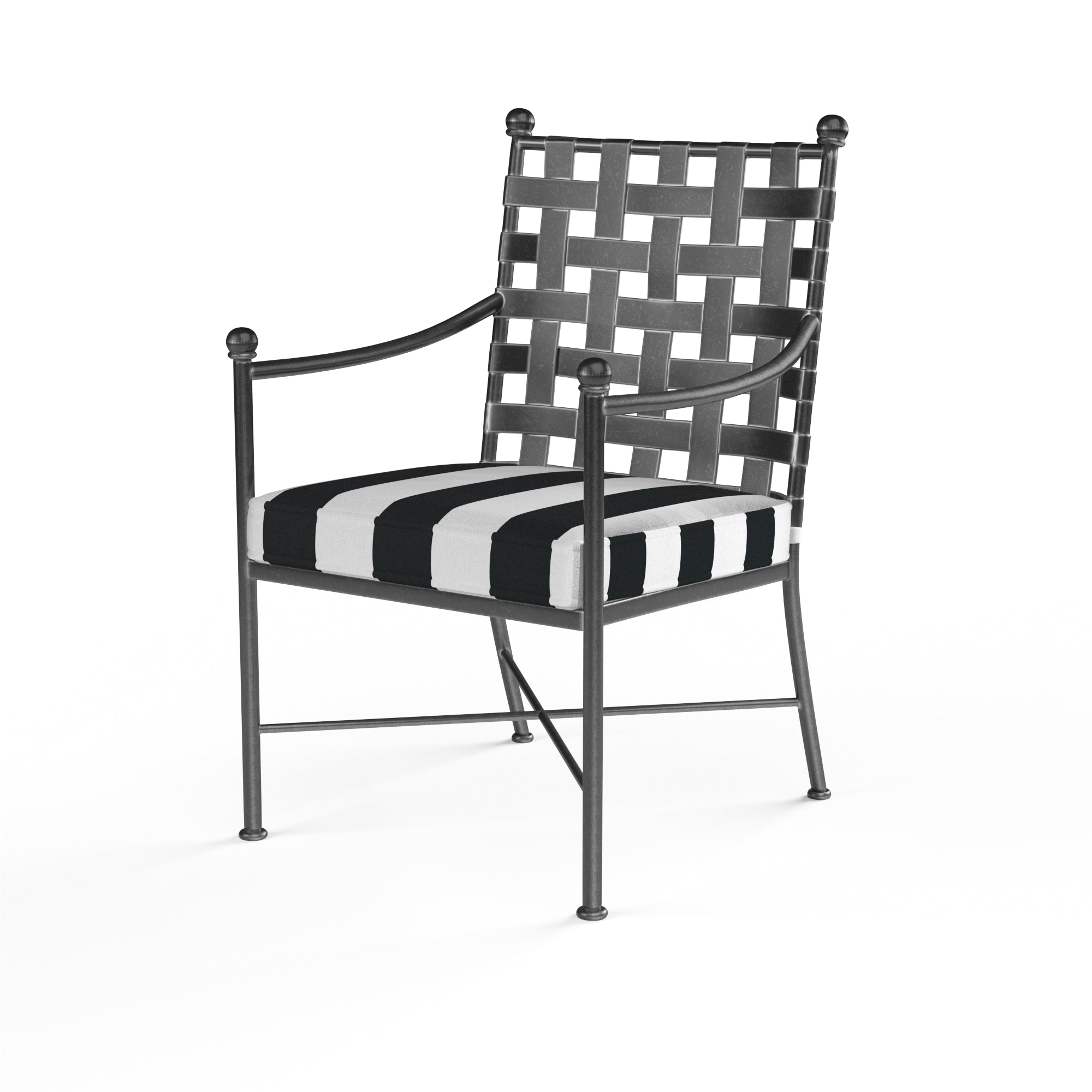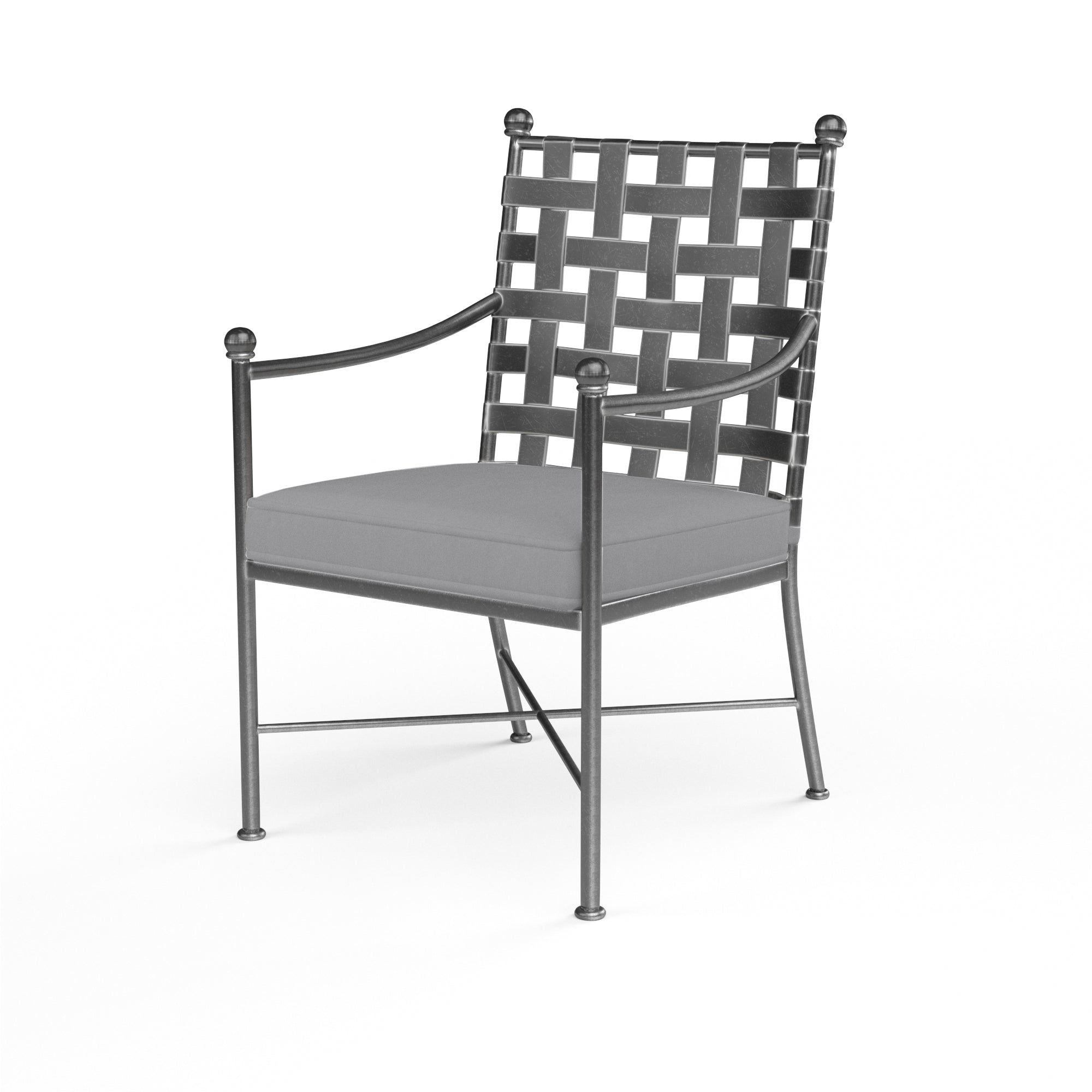 Constructed in expertly crafted wrought iron, the Provence Dining Chair displays a woven back to emulate basket weave, and subtly brushed Century Pewter antique finish. Gently bowed arms and generous seat are scaled for absolute comfort.