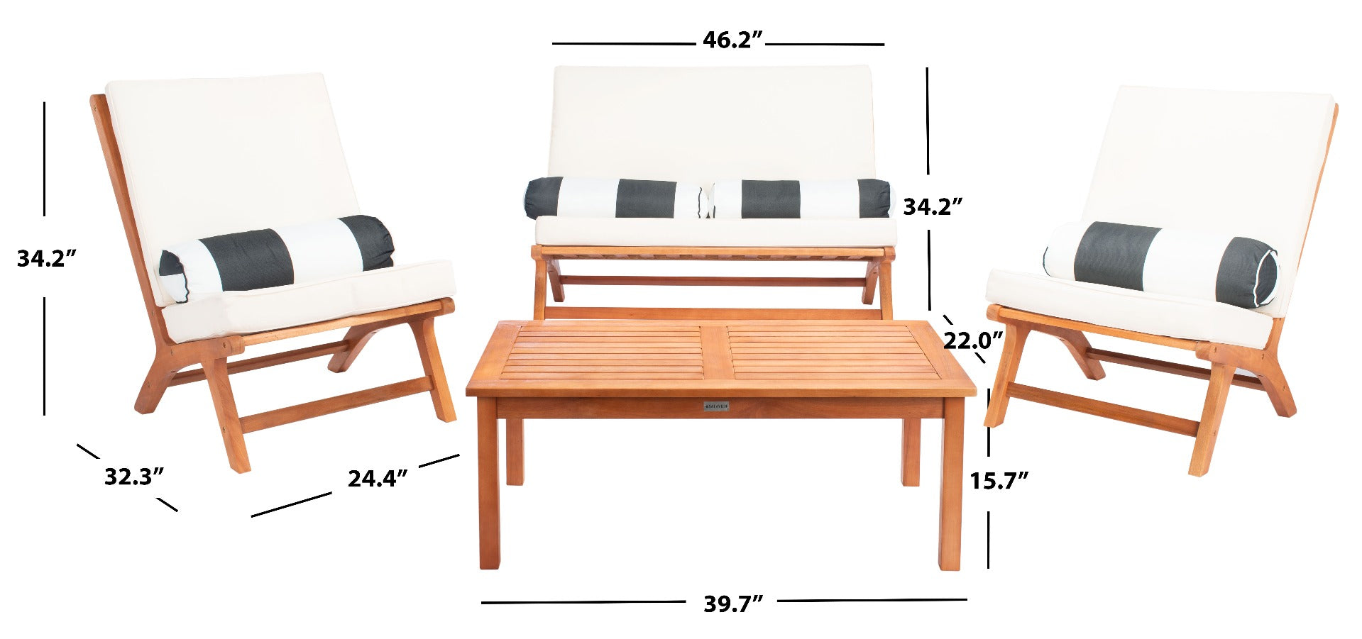 - Size Length: Bench: 32.3; Armchair: 32.3; Table: 22