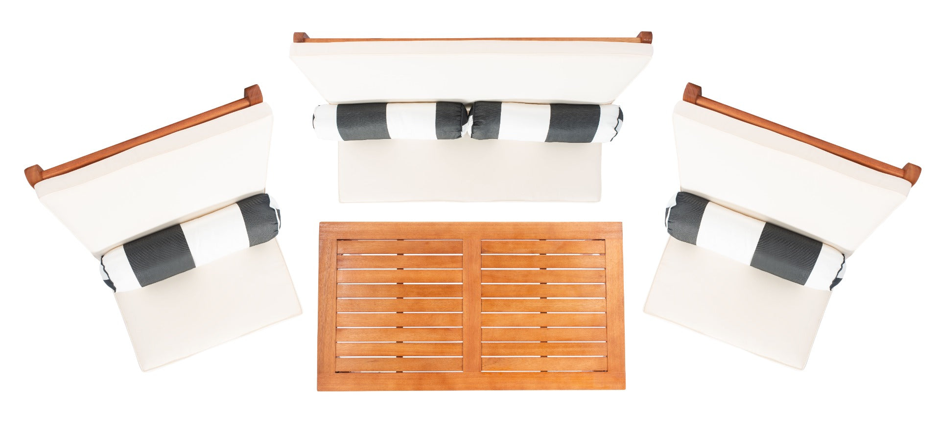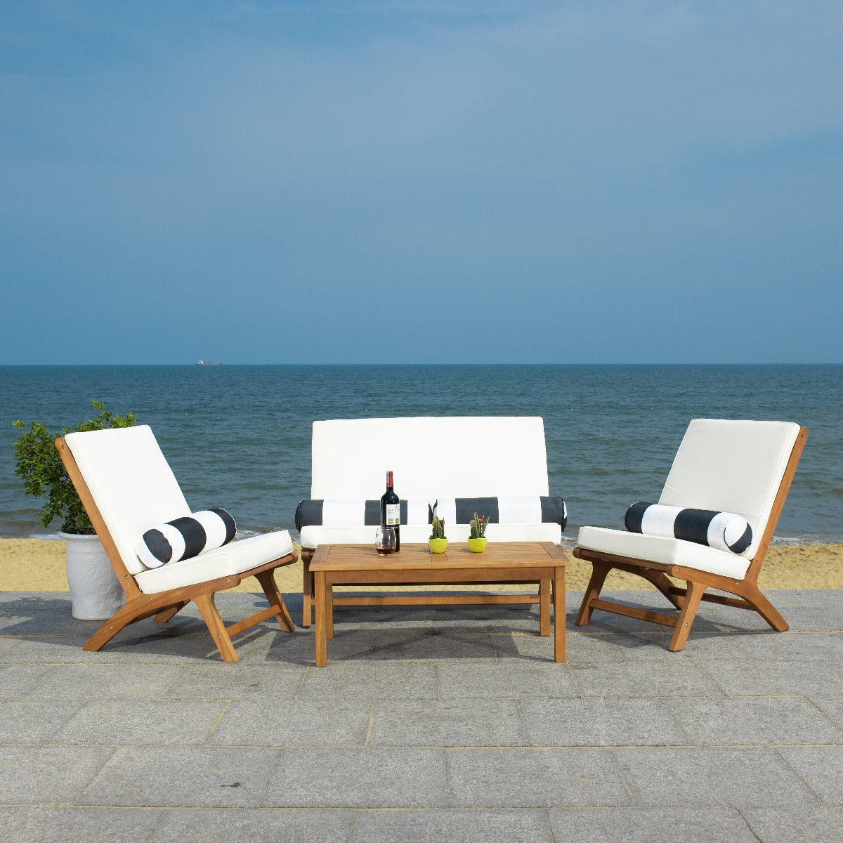 Alive with surf and sand, Sao Paulo?? legendary beaches inspired this 4 piece outdoor living set. Crafted of rich natural wood, its clean lines and plush beige upholstery is ideal for afternoon lounging by the pool. Its black and white bolster pillows are complementary.