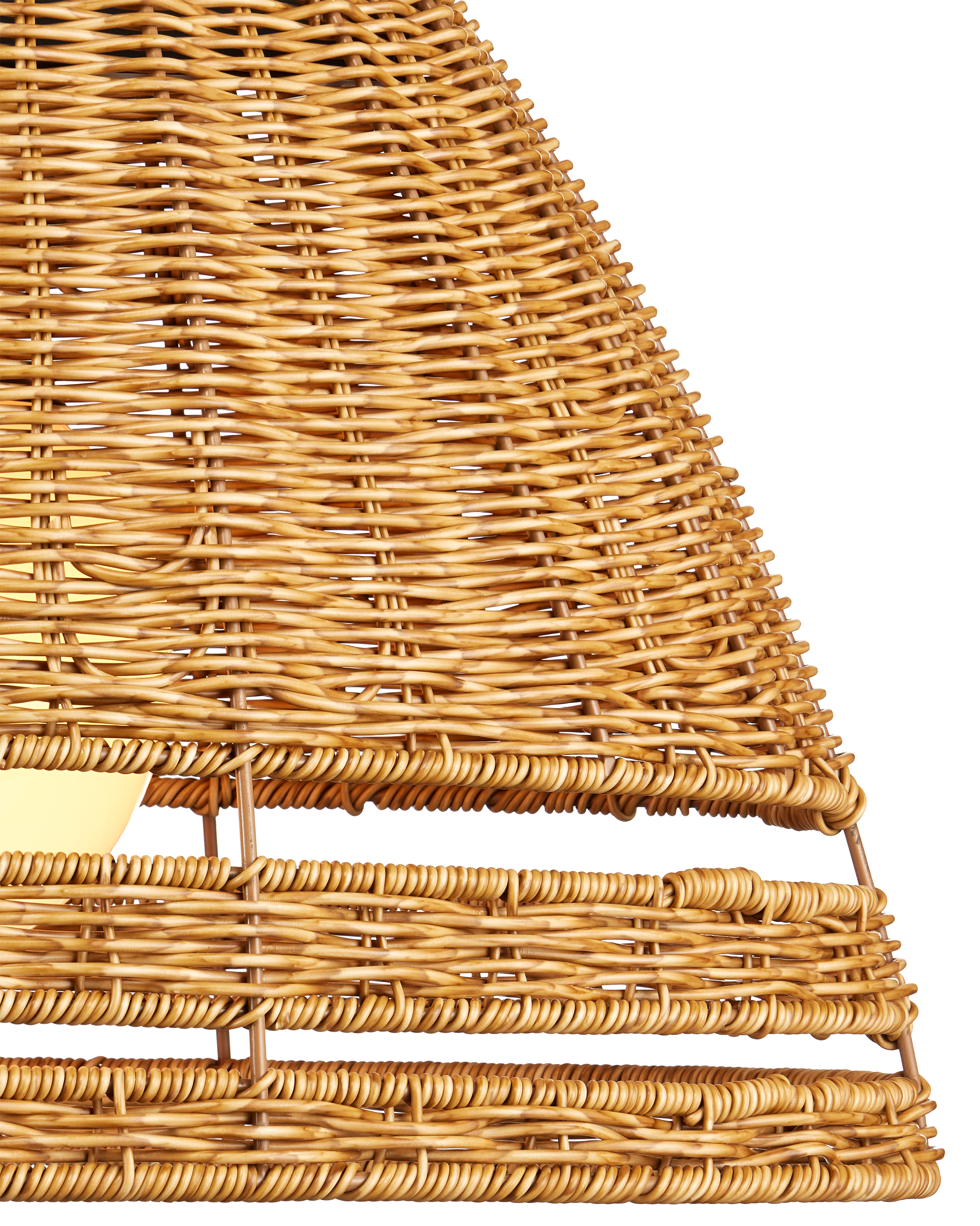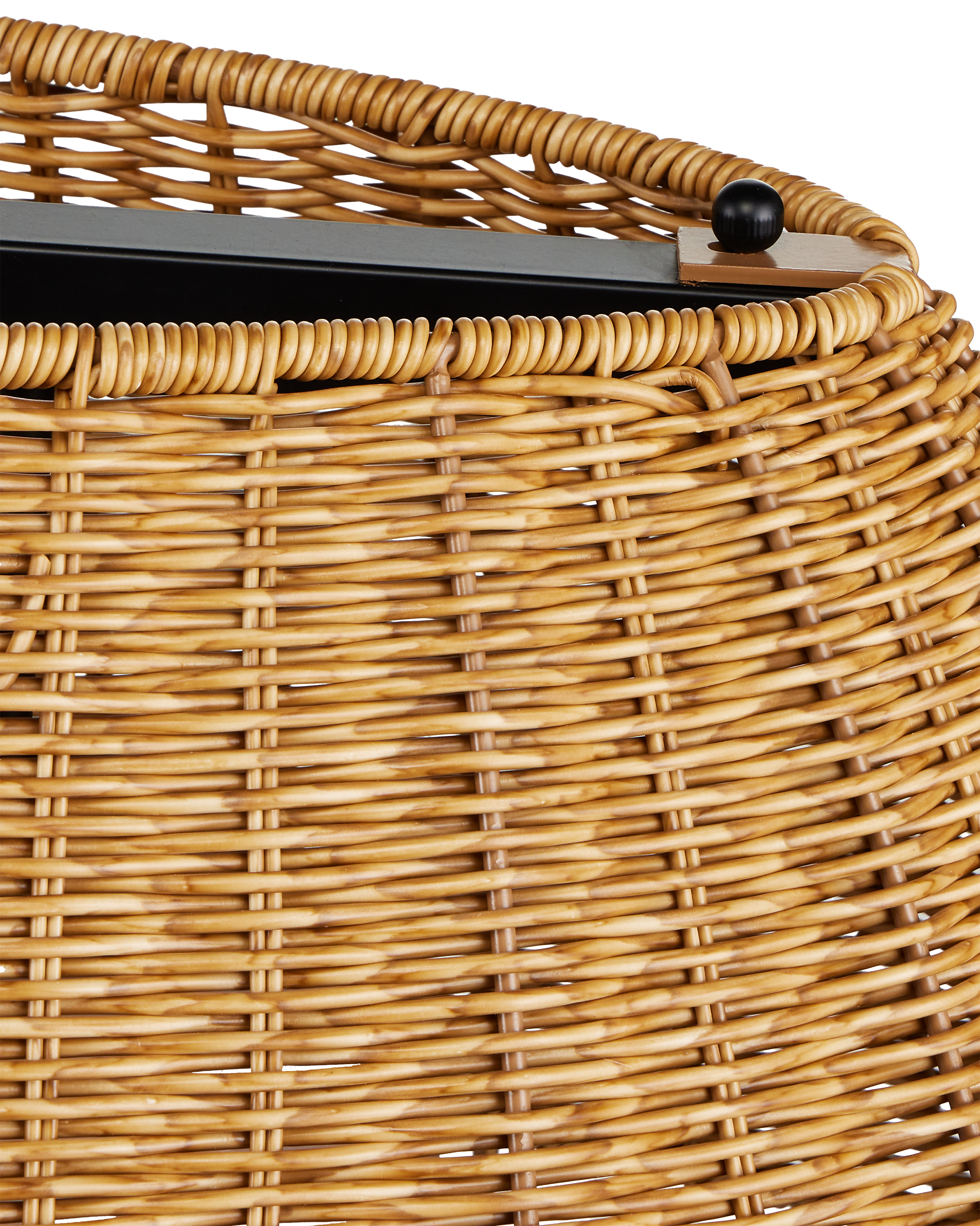 The Barbary Oval Outdoor Chandelier features an inverted boat-shaped shade woven by hand from durable, all-weather synthetic wicker in a warm tan tone. The tight, uniform weave showcases artisanal craftsmanship and surrounds a central circular cut-out that reveals a glowing milk-glass globe. Suspended from a black powder-coated rod, this three-light chandelier is wet-location tested, making it a stylish and reliable choice for covered patios, porches, or outdoor entryways. Adjustable from 18.5" to 60.5" with use of included chain/rod kit/cable. If your space calls for a longer drop, additional chain/rods/cable is available for purchase.