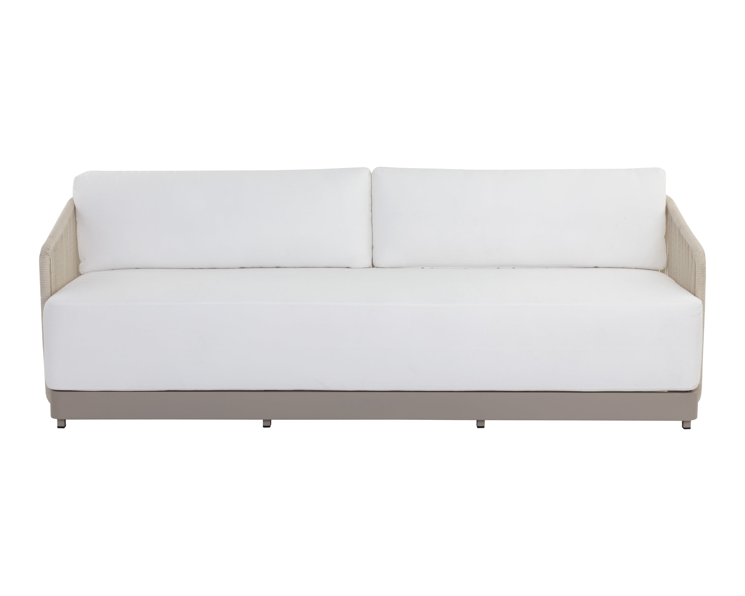Introduce refined modern style outside with this impressive sofa from the Outdoor by SUNPAN collection. Upholstered in stinston white fabric with a powder-coated greige aluminum frame. Completed with cream rope weaving on the seat exterior.