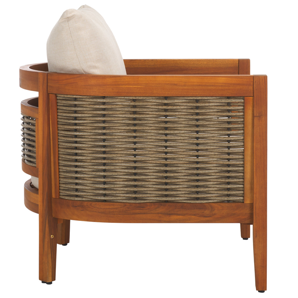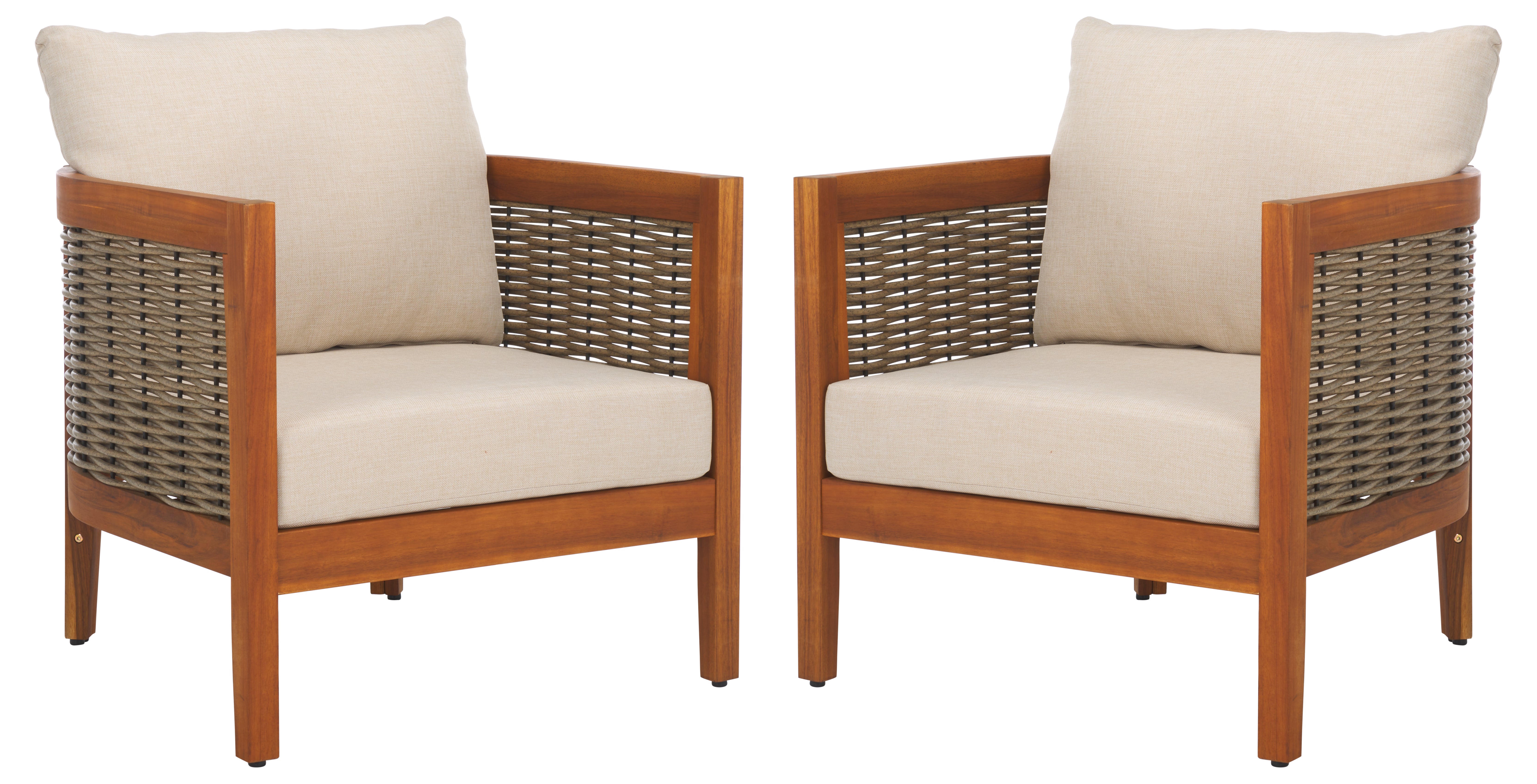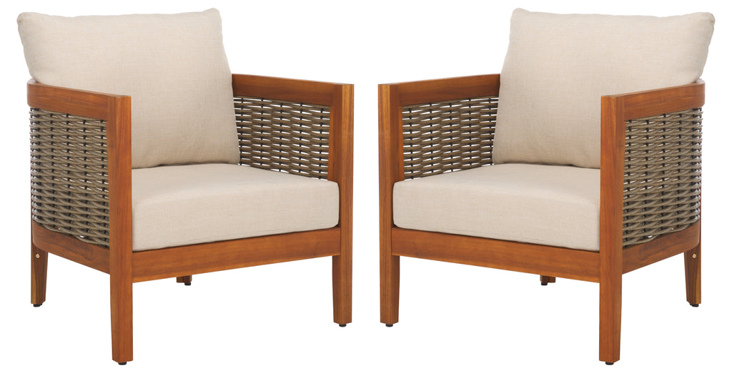 Introducing the Amanda Chair Set of 2 Outdoor - a sublime intersection of function and style. Flaunting a natural frame complemented by elegant taupe cushions, these chairs embody quiet sophistication. Crafted from Acacia wood, the chairs' frame showcases the intricate grain and warm color of this distinctive wood, creating a rustic charm that enhances any outdoor space.