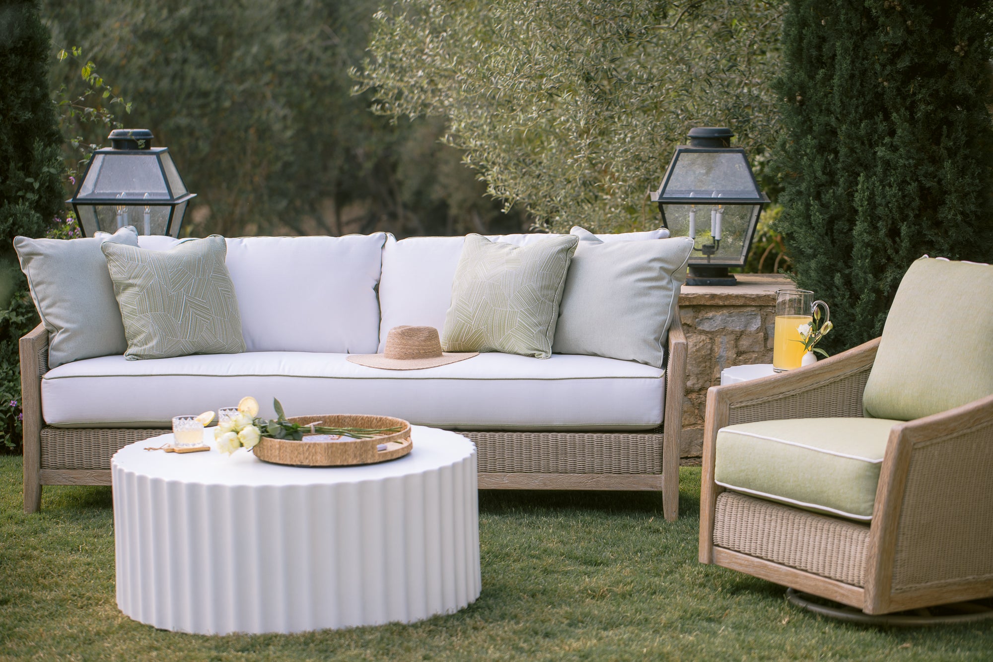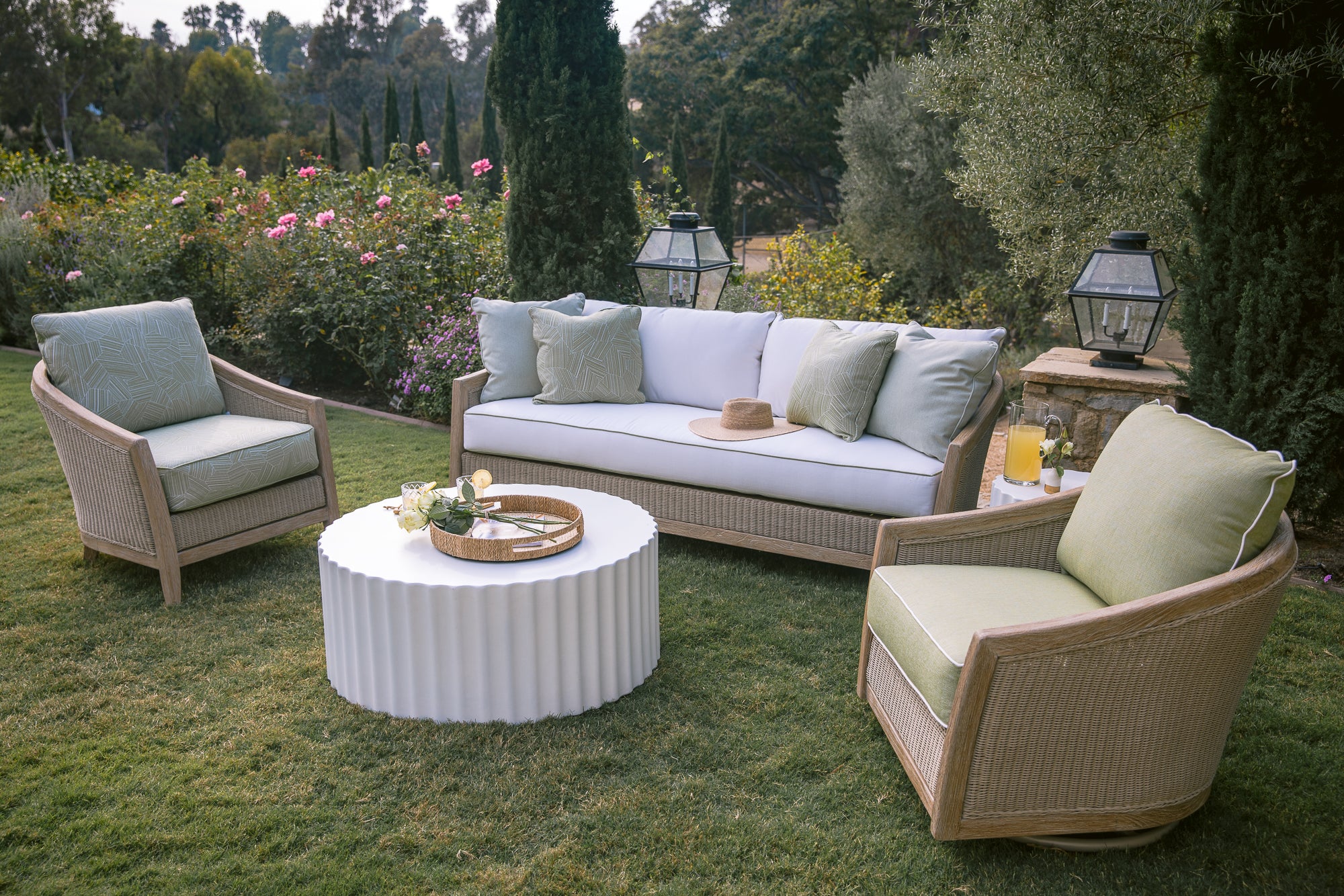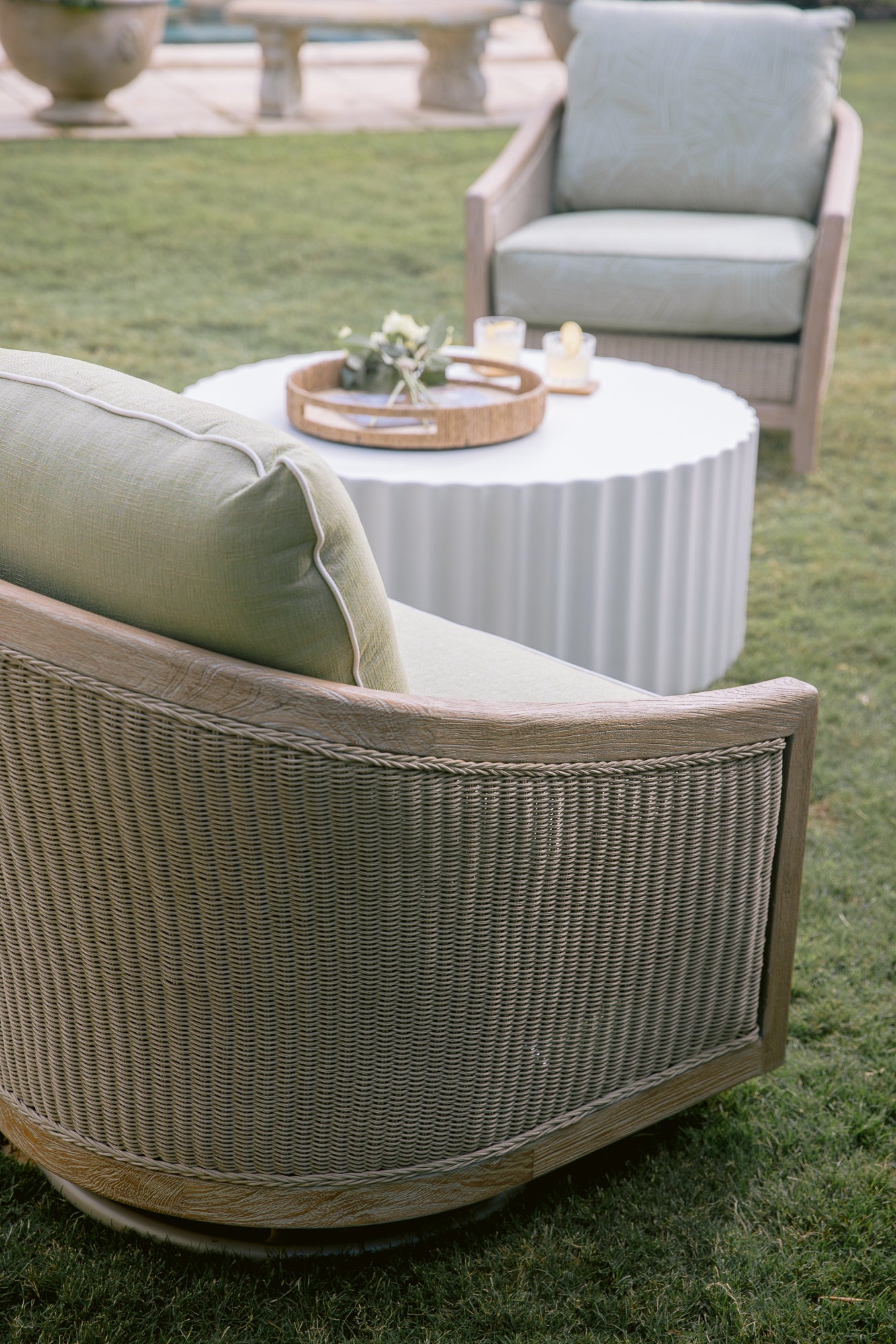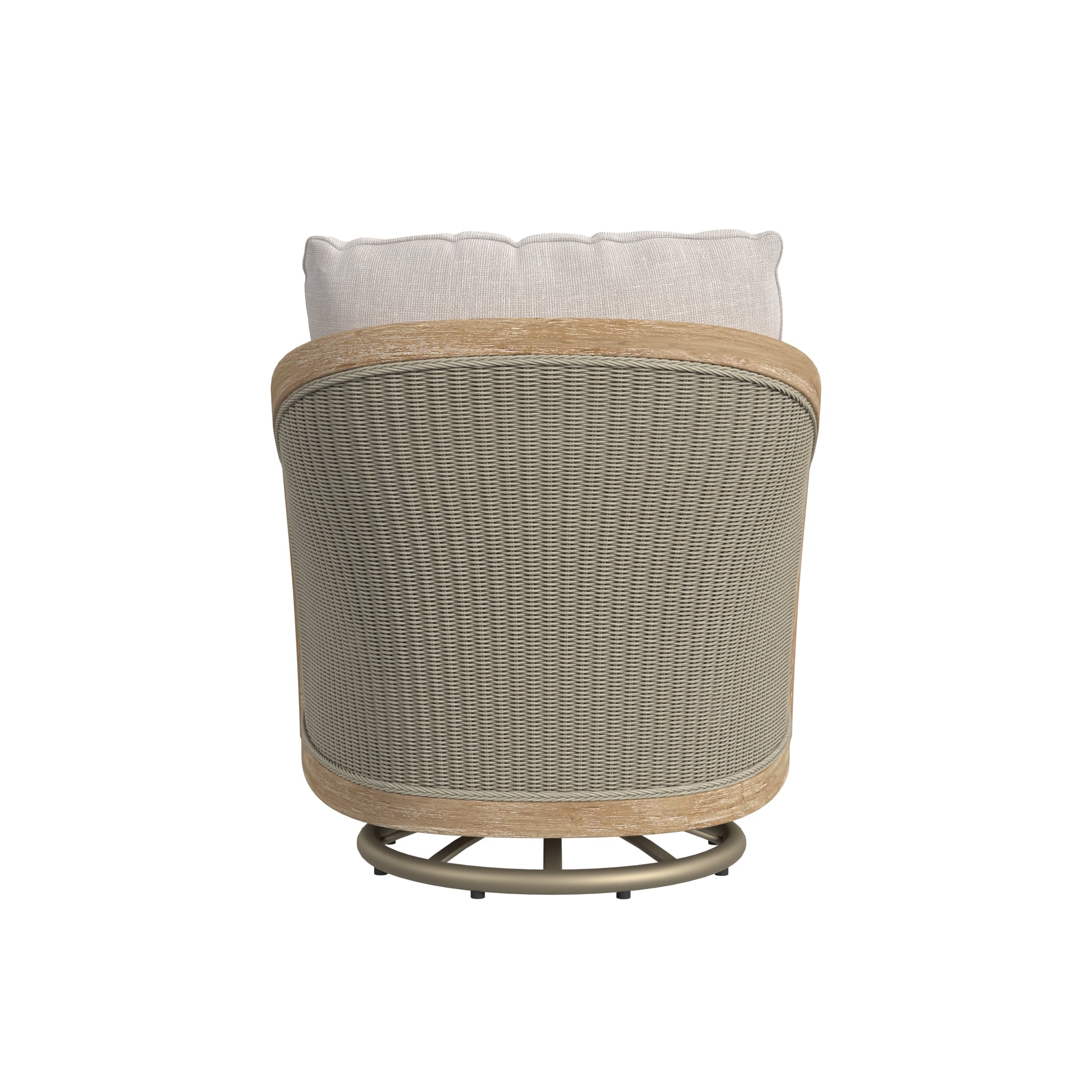 Sunset West's Cambria Barrel Back Swivel Club Chair is inspired by classic silhouettes, designed with contemporary materials. With mixed material of resin and solid teak wood, Cambria features the signature coastal teak finish and textured Latte weave. It's curved silhouette with flared skirt, barrel back and sloped arm brings maximum style and comfort.