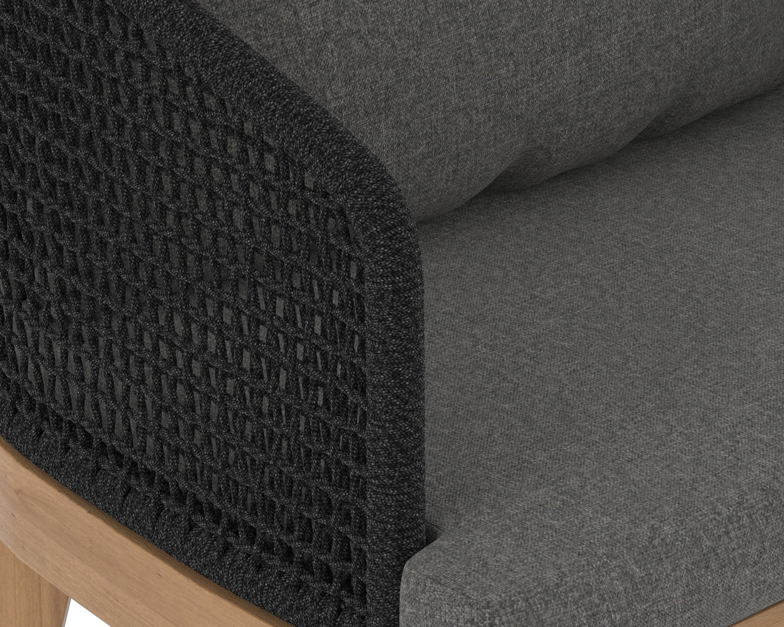 Blur the lines of inside and out with this beautiful outdoor dining chair. This comfortable design features a barrelback frame wrapped in dark greymix weave and seat cushions in gracebay grey fabric. A natural teak wood base completes the look. Suitable for indoor and covered outdoor spaces.