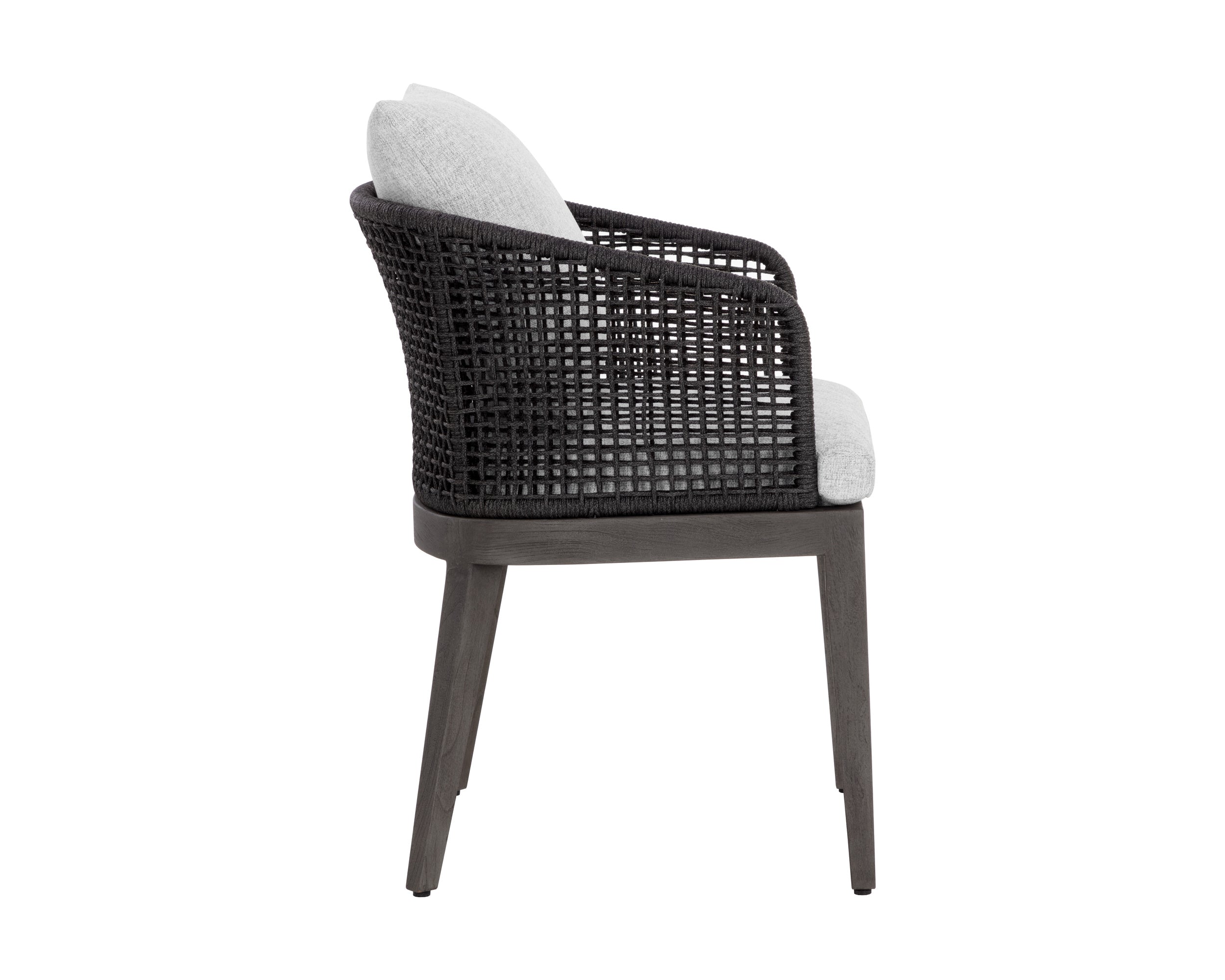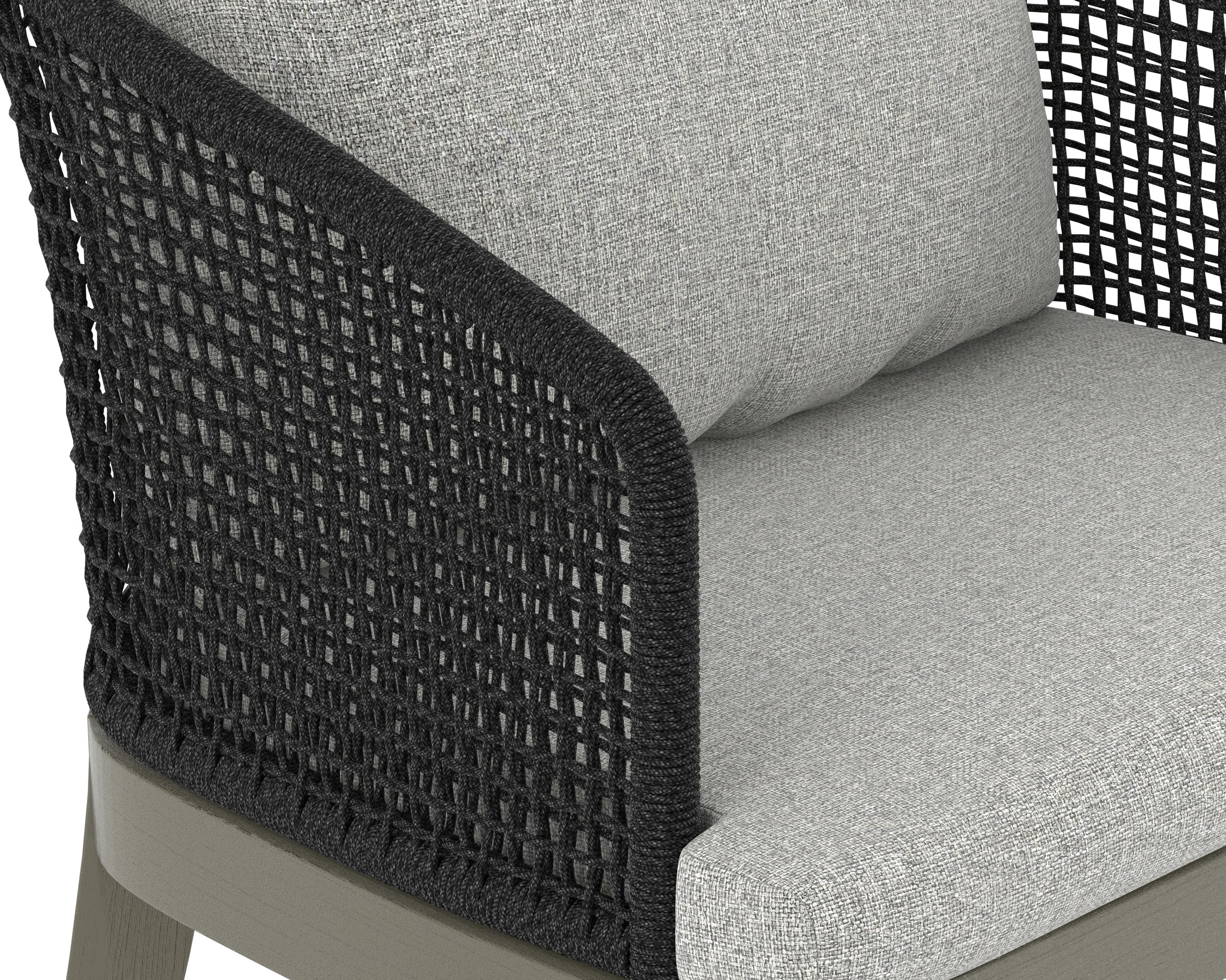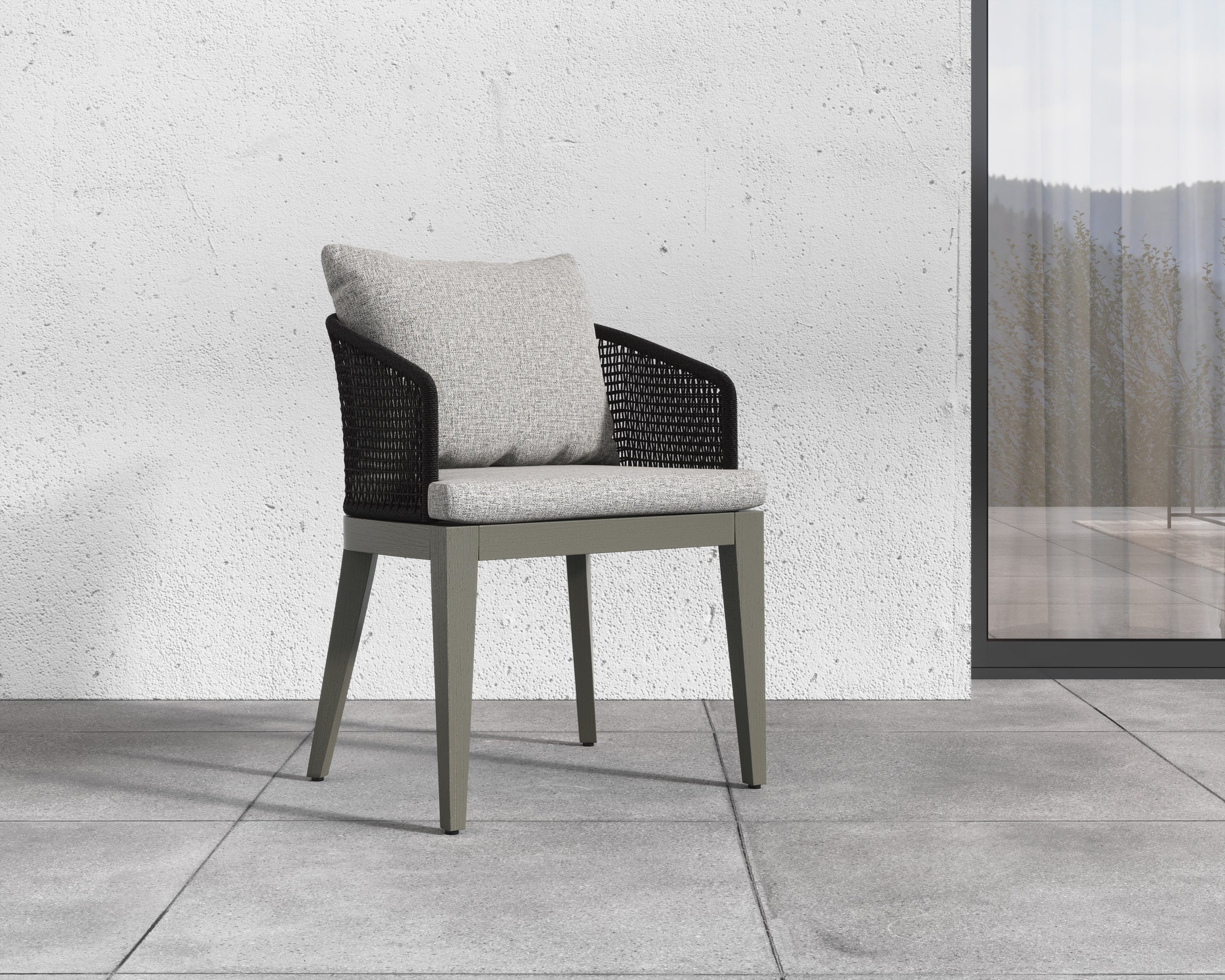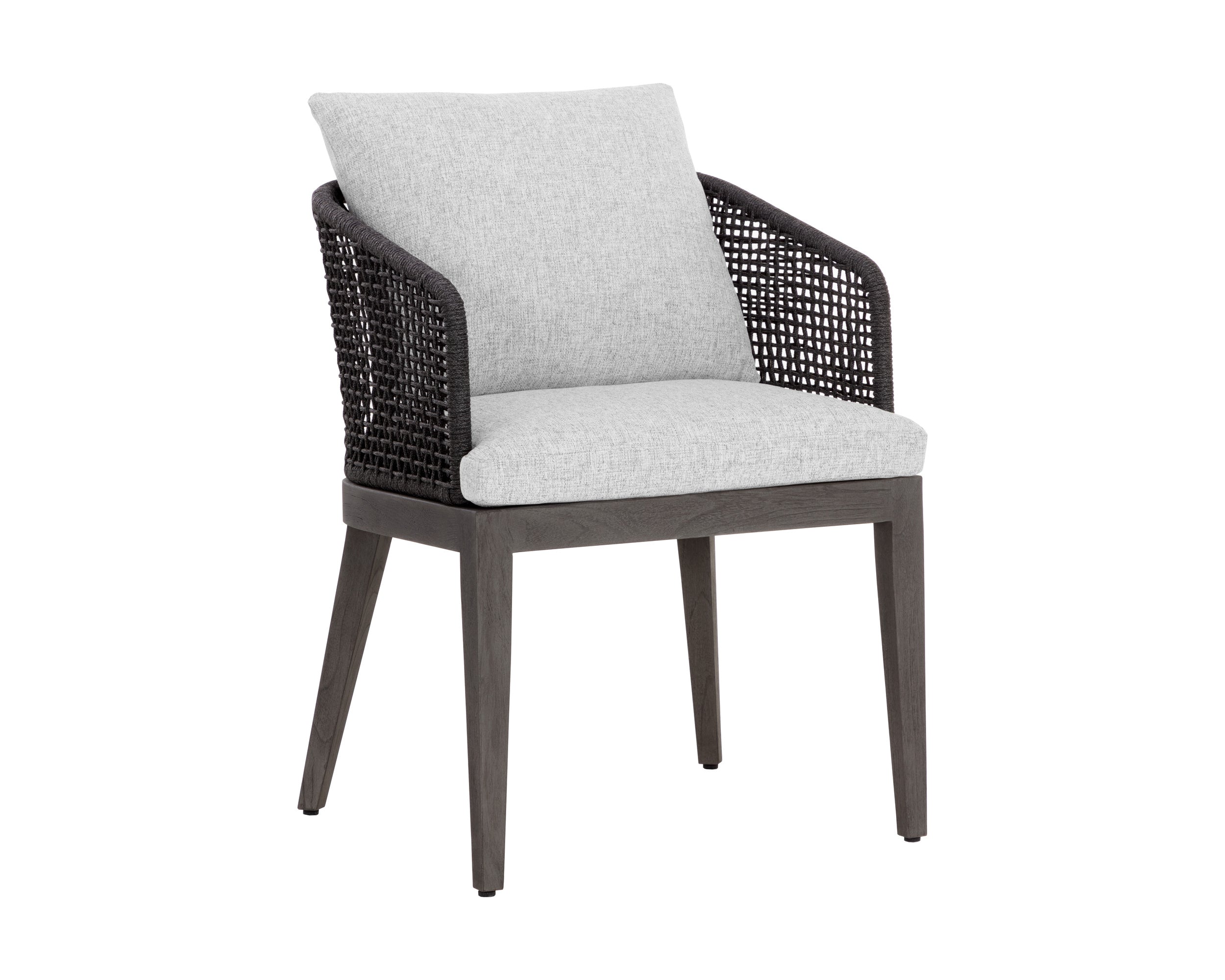 Blur the lines of inside and out with this beautiful outdoor dining chair. This comfortable design features a barrel back frame wrapped in dark greymix weave and seat cushions in copacabana marble fabric. A smoked grey teak wood base completes the look. Suitable for indoor and covered outdoor spaces.