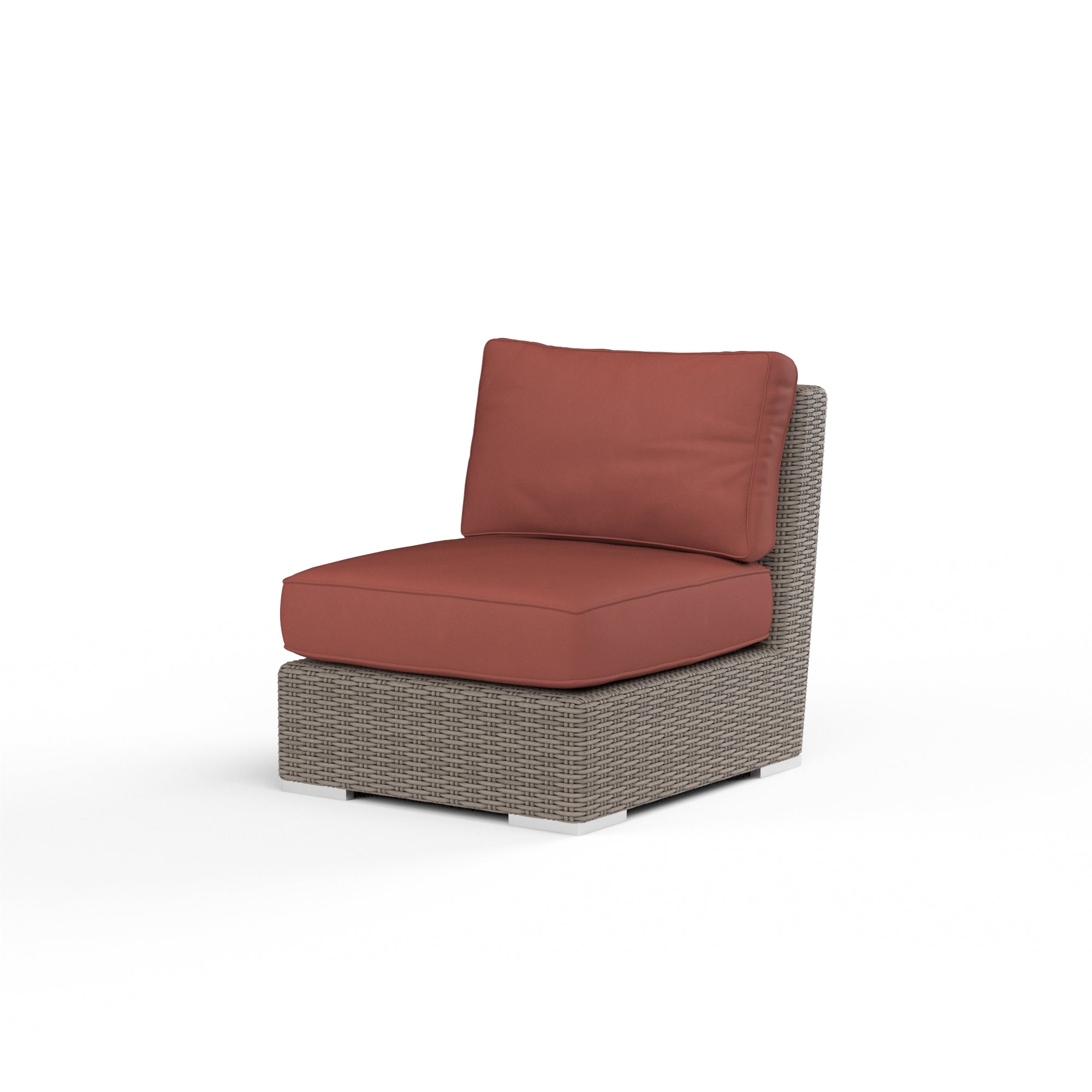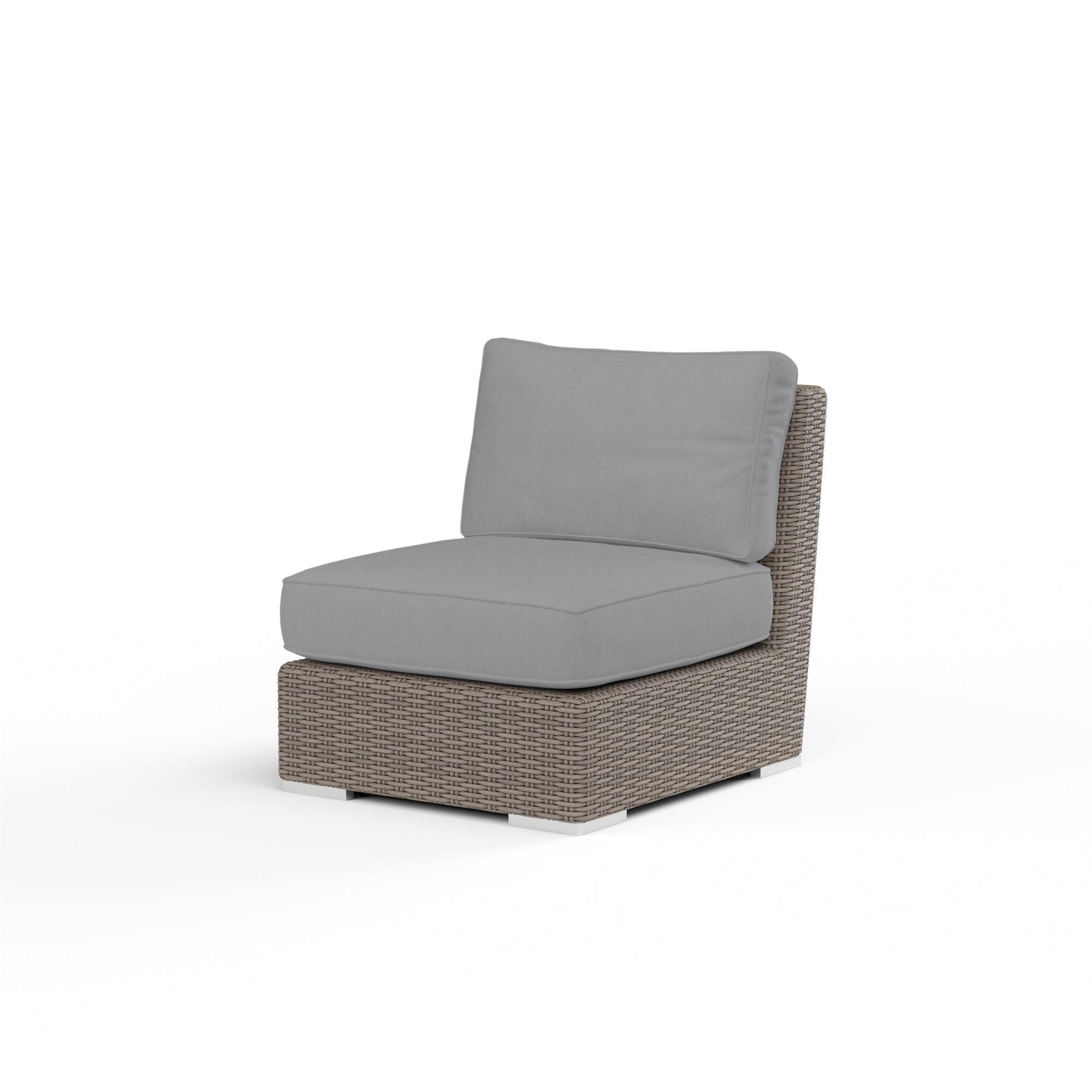 Sunset West's Coronado Armless Chair embodies casual sophistication for a wonderfully versatile look. Transitional lines are wrapped in a beautiful resin wicker finish in Driftwood. Outstanding comfort is provided with plush, fast drying cushions and generous seating proportions.