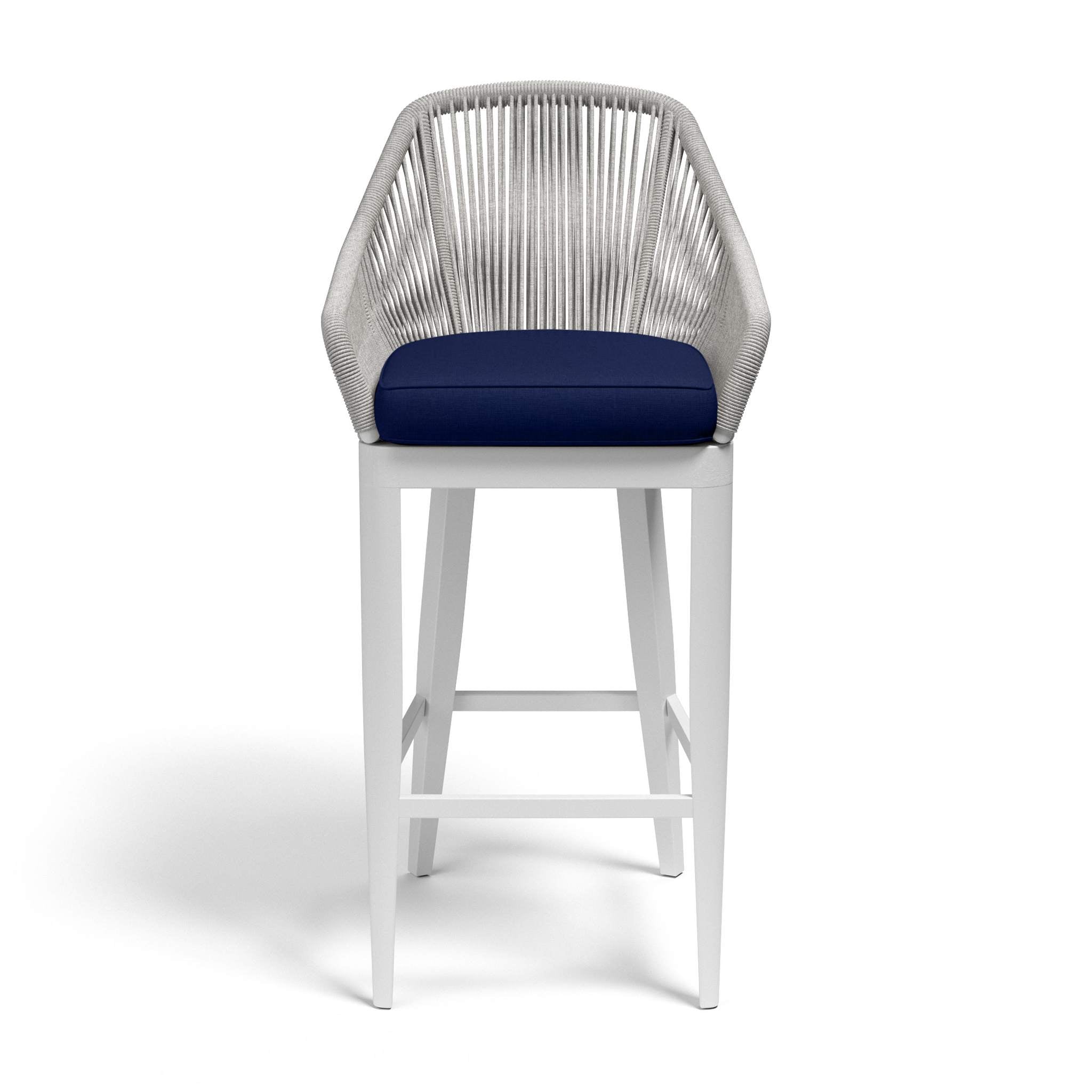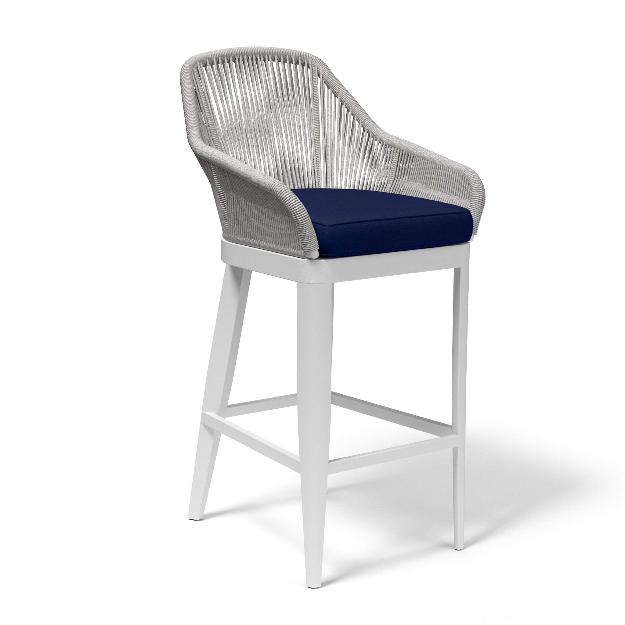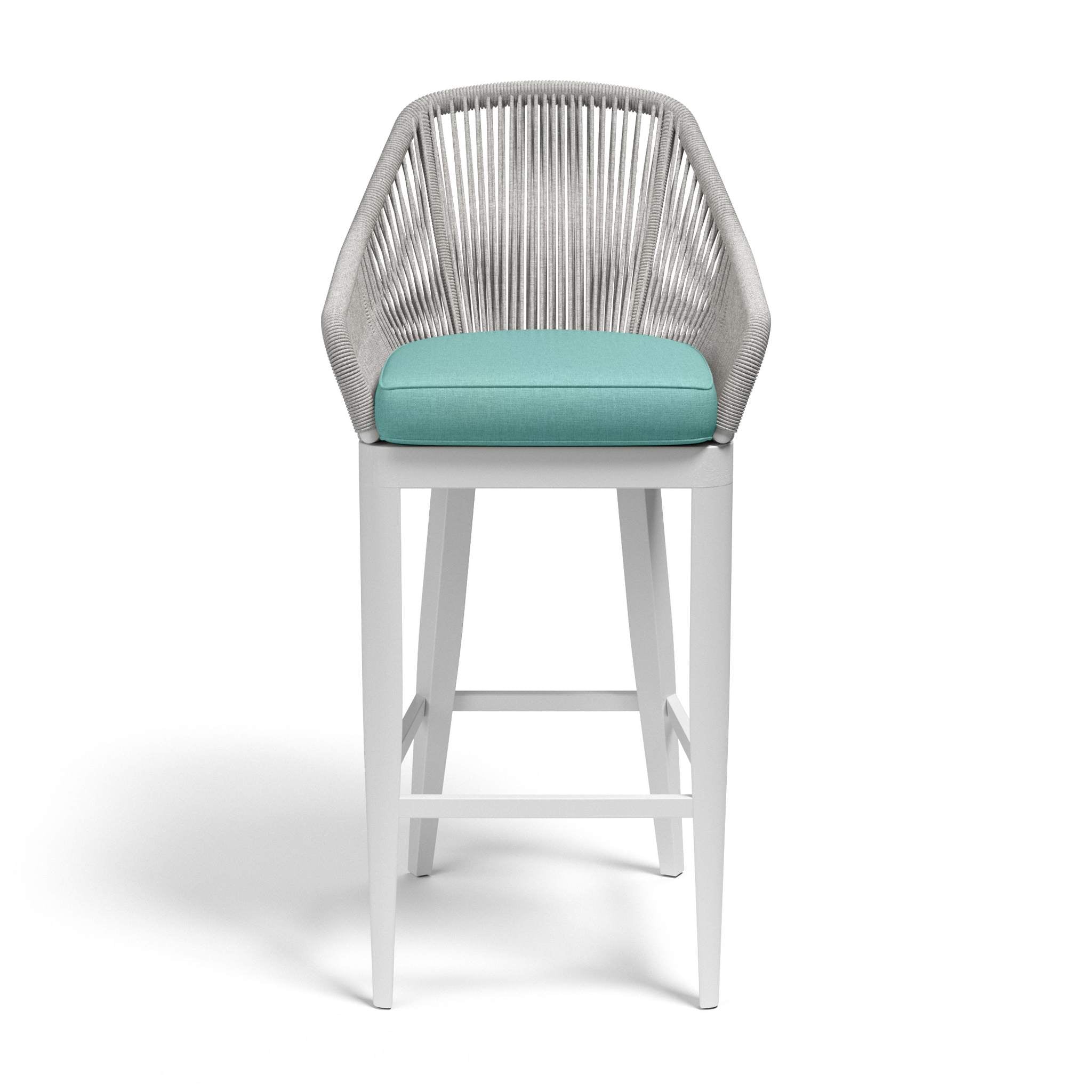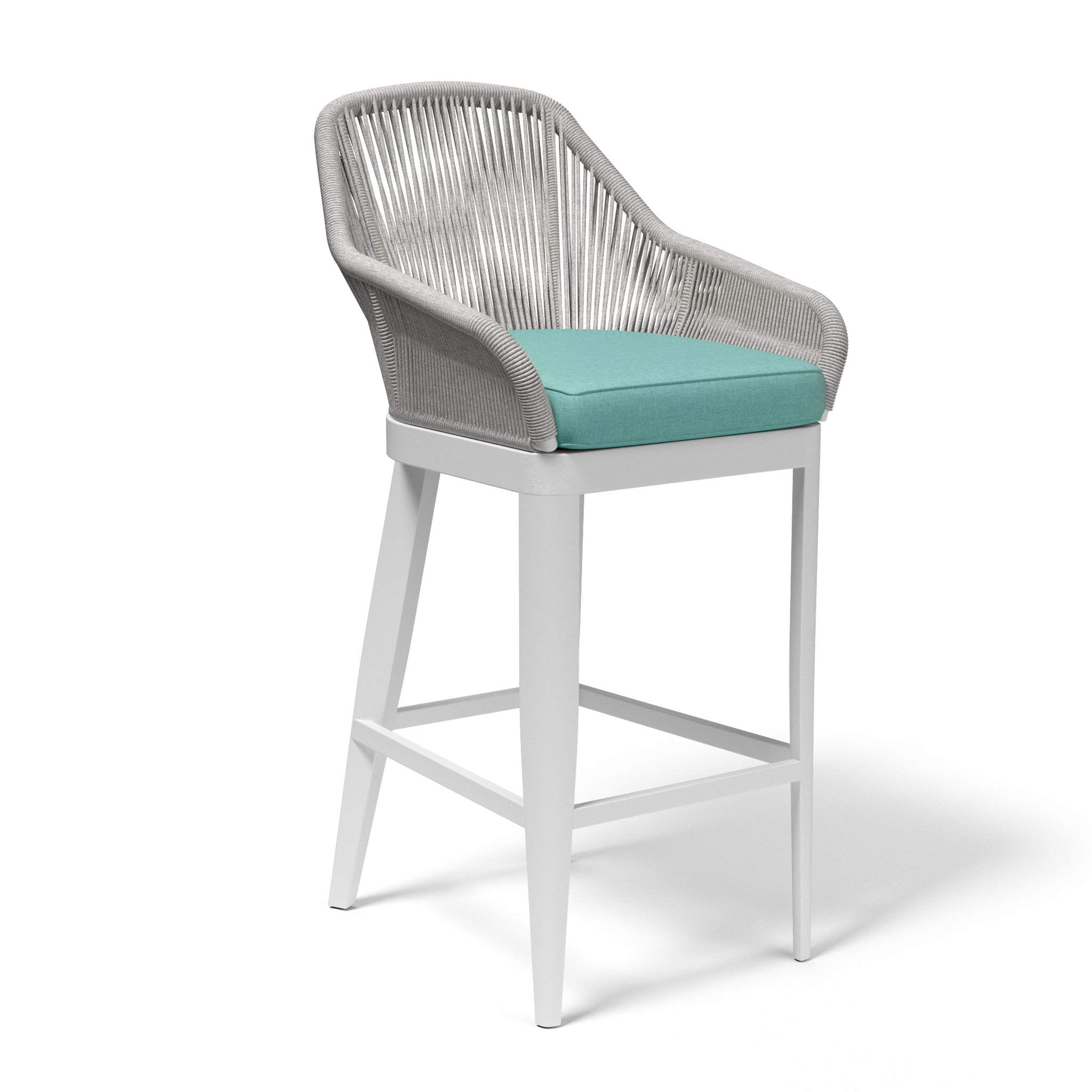 The Miami Barstool embodies clean lines and thoughtful angles with its linear frame and striated rope design. Its rust free aluminum frame is expertly hand wrapped with premium all-weather olefin rope in a silver-grey, and is finished with a frost white tapered leg.