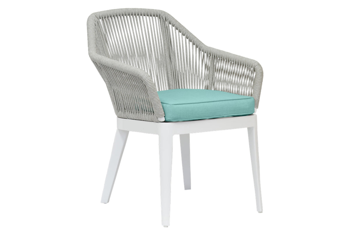 The Miami Dining Chair embodies clean lines and thoughtful angles with its angled frame and striated rope design. Its rust free aluminum frame is expertly hand wrapped with premium all-weather olefin rope in a silver-grey, and is finished with a satin white tapered leg.