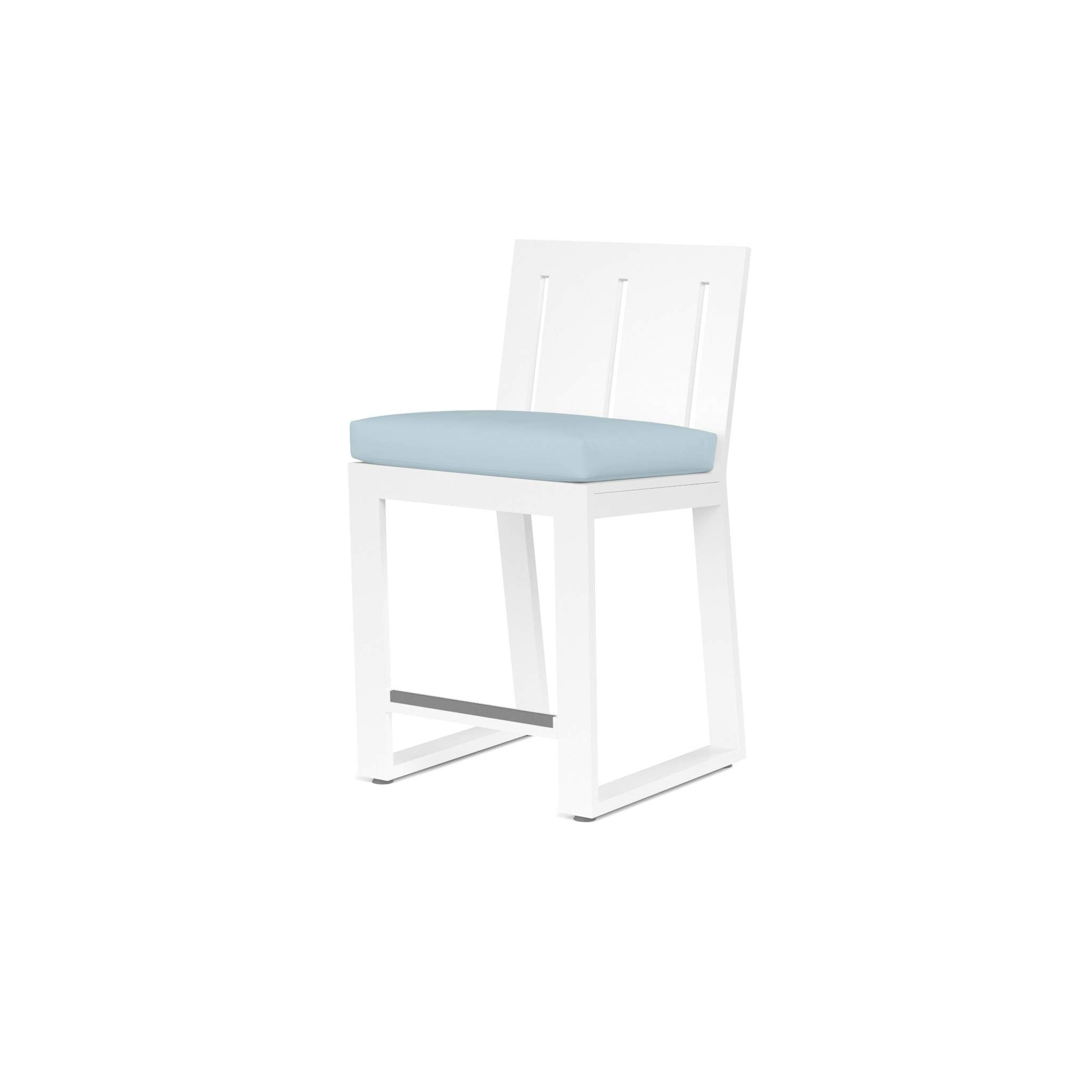 The Newport Bar Stool blends modern and industrial sensibly into one striking design, featuring a vertical slat back and armless linear frame, crafted in powder coated aluminum with a Satin White finish.