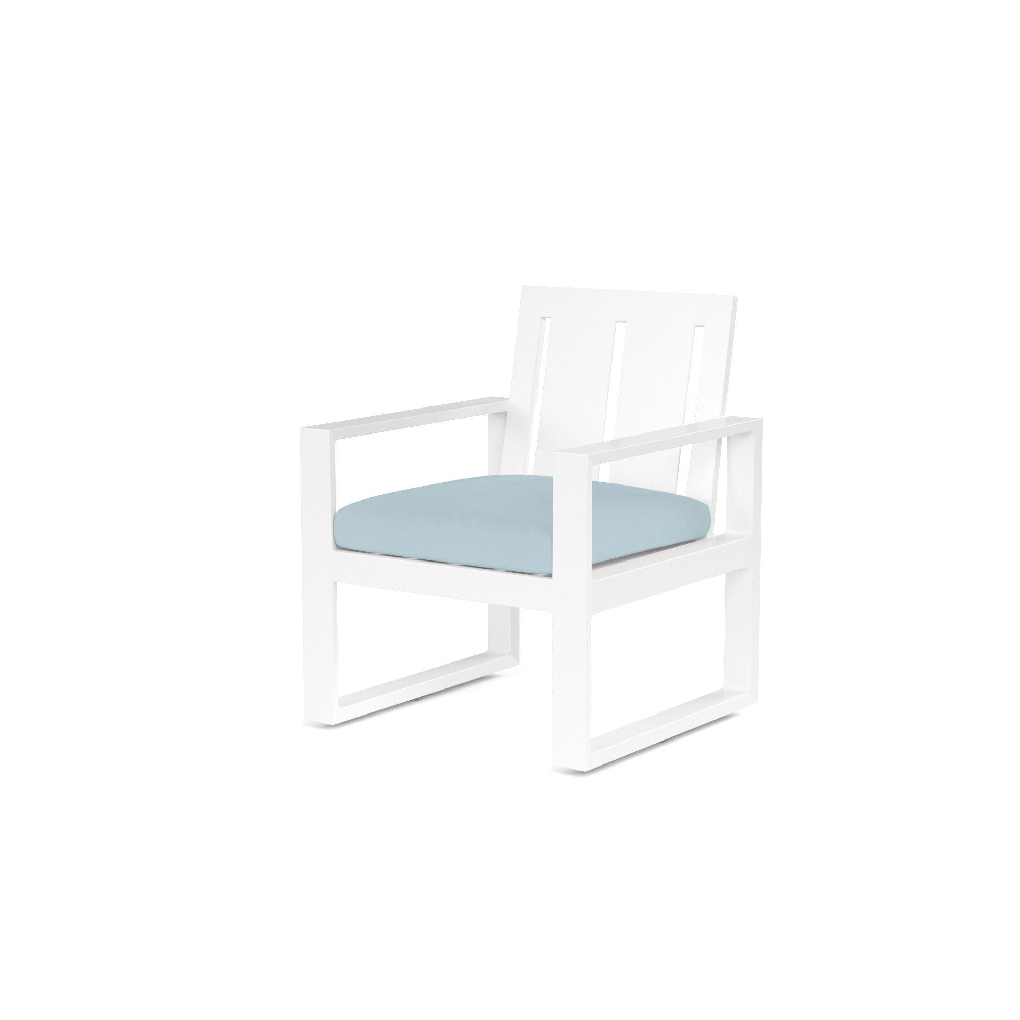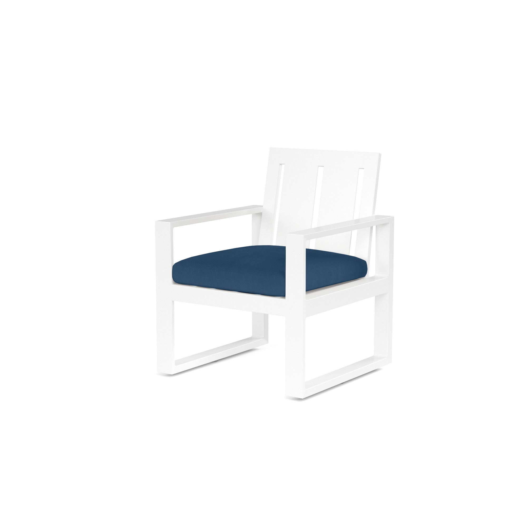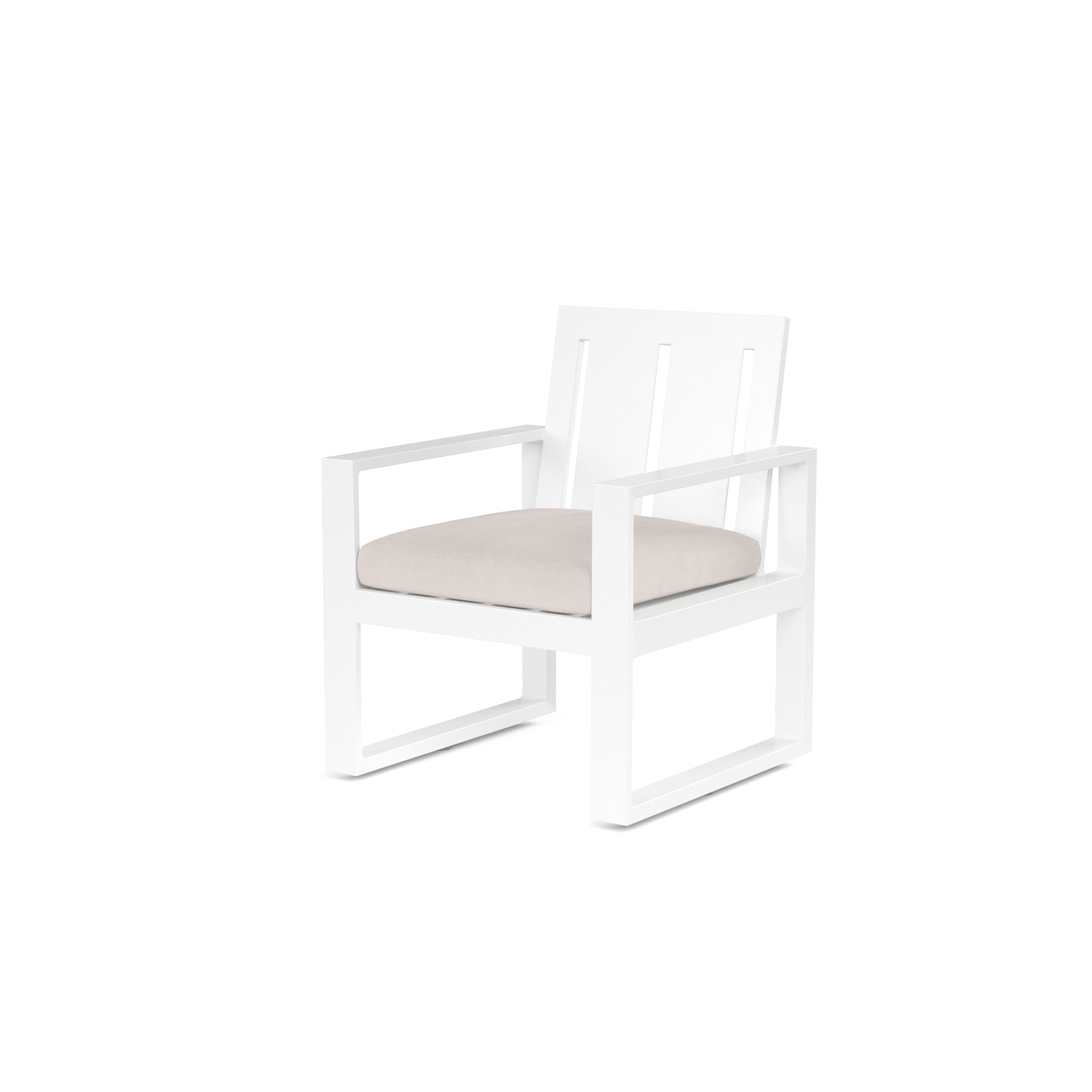 The Newport Dining Chair blends modern and industrial sensibly into one striking design, featuring a wide slat back and linear frame, crafted in powder coated aluminum with a Satin White finish.
