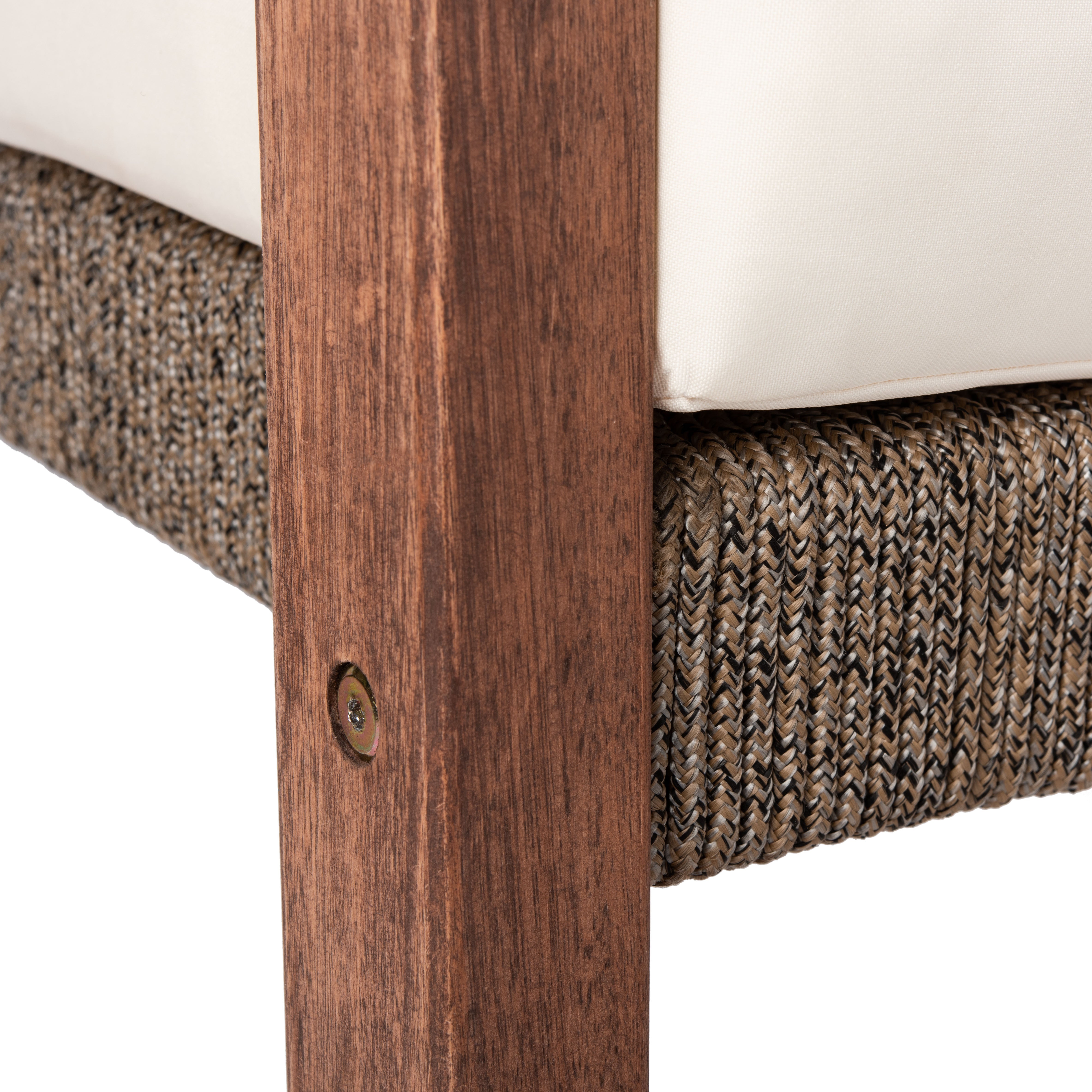 Enjoy an instant al fresco experience with this contemporary 4 piece living set. Each piece is finely crafted with natural acacia wood. Its sumptuous pillows are an invitation for family and friends to gather.