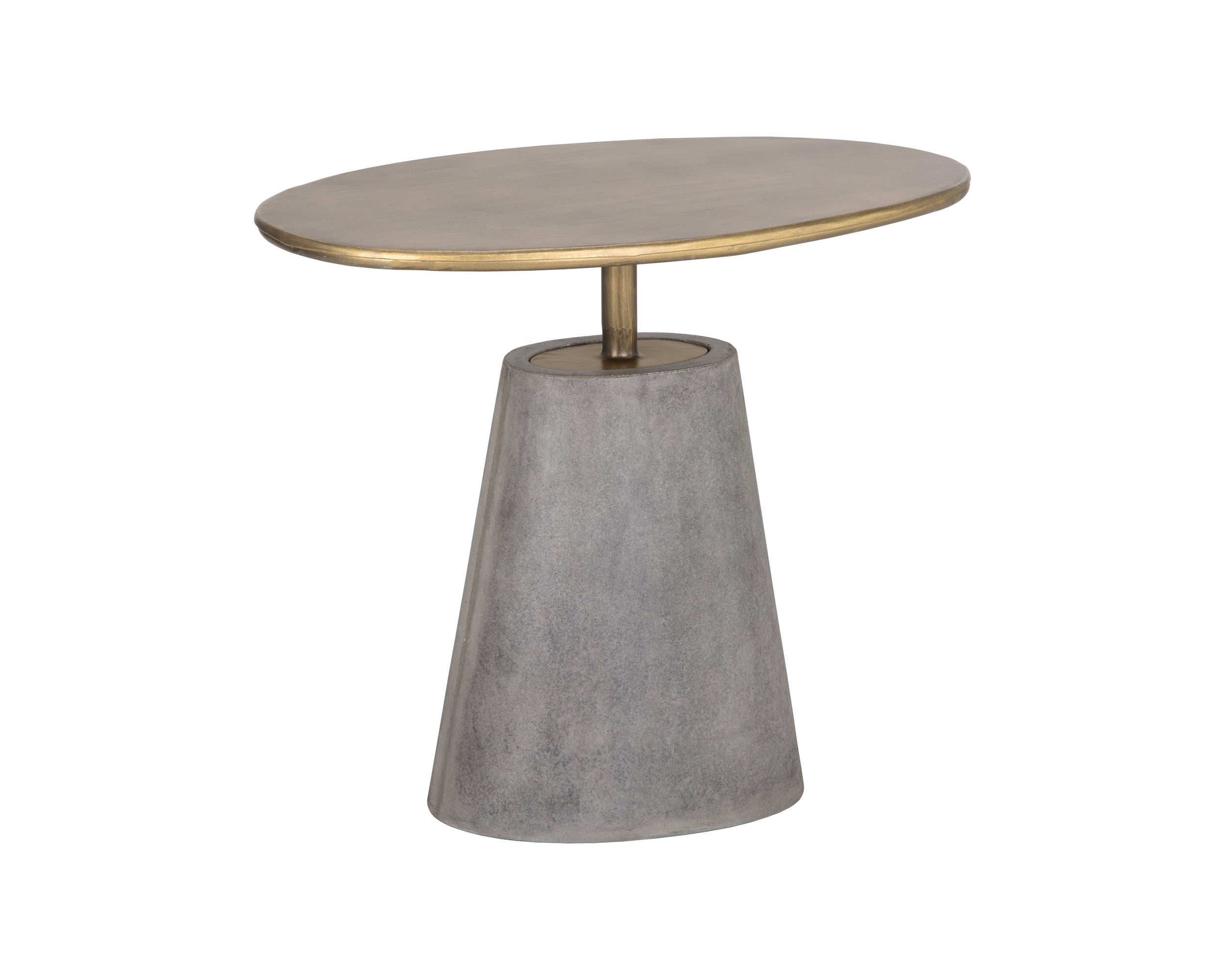 This unique side table will bring a bold yet warm look to living, lounge, and bedroom spaces. Features a dramatic grey concrete base with a brushed brass metal oval top.
