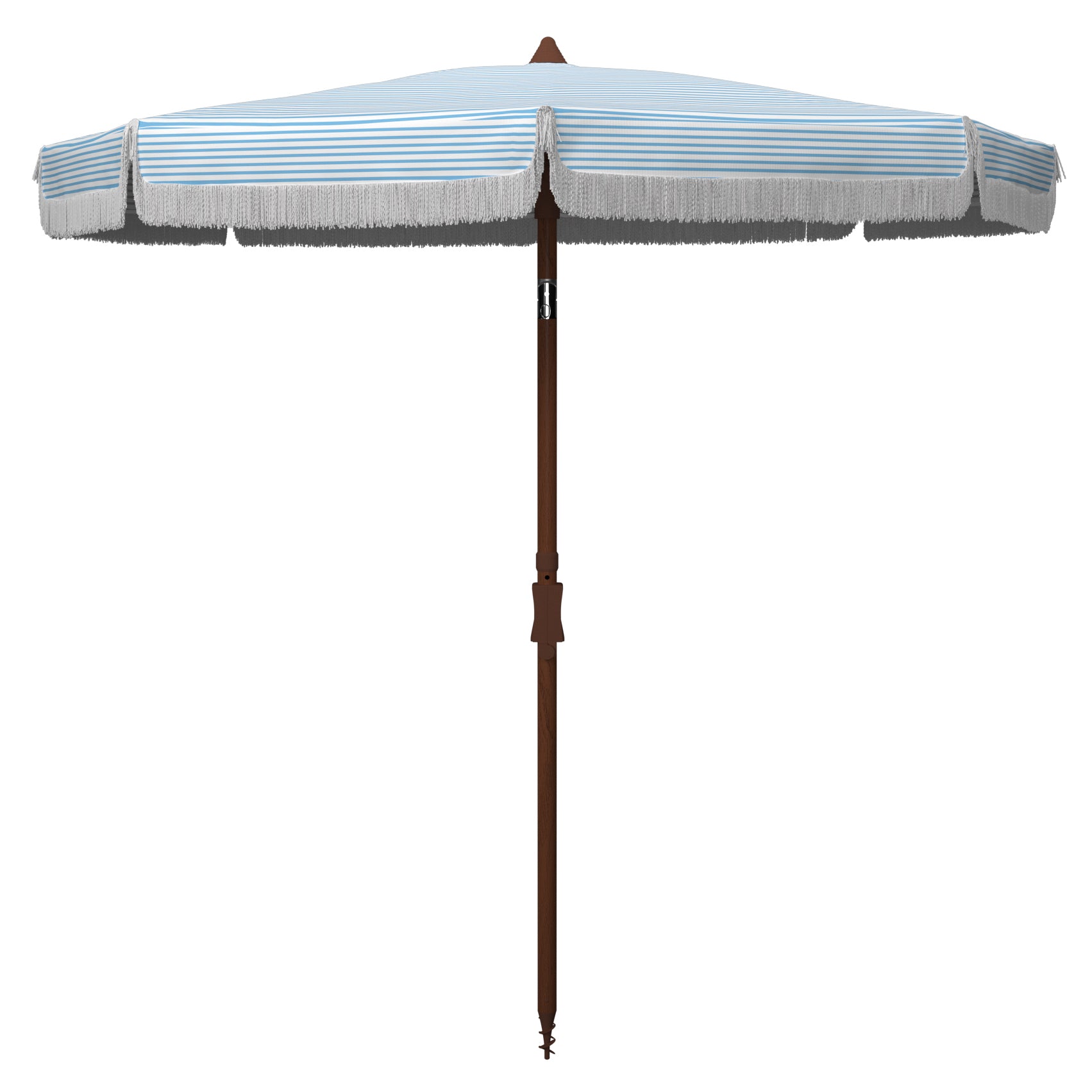 Give your backyard a touch of coastal cool flair with this Copen Umbrella. Copen?? unique pairing of a light blue and white striped canopy with whimsical fringe details makes for fashion forward outdoor lounging, while its metal tilt mechanism allows for angle preference to protect you from the sun?? rays.