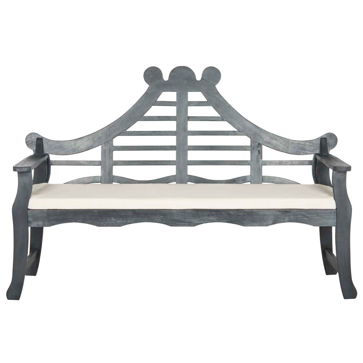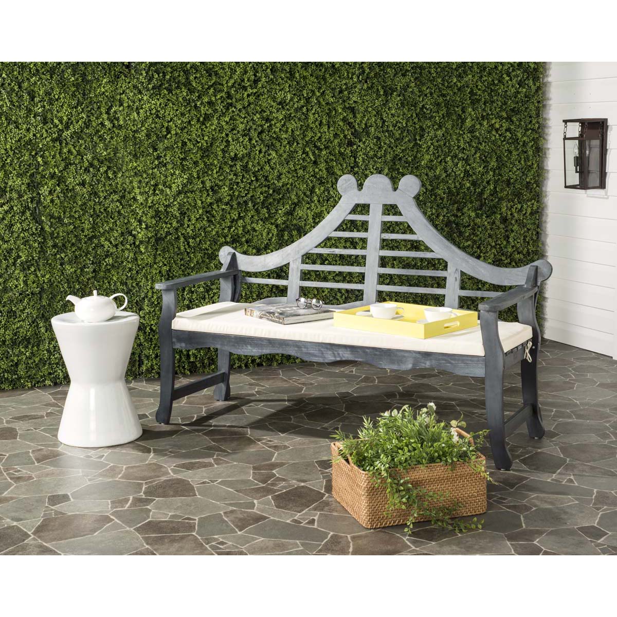 Inspired by Asia?? majestic outdoor gardens, the exotic style of this bench is at home in traditional or classic outdoor decor. Its ornately carved details with a rich ash grey finish and plush beige cushion make it a modern heirloom.