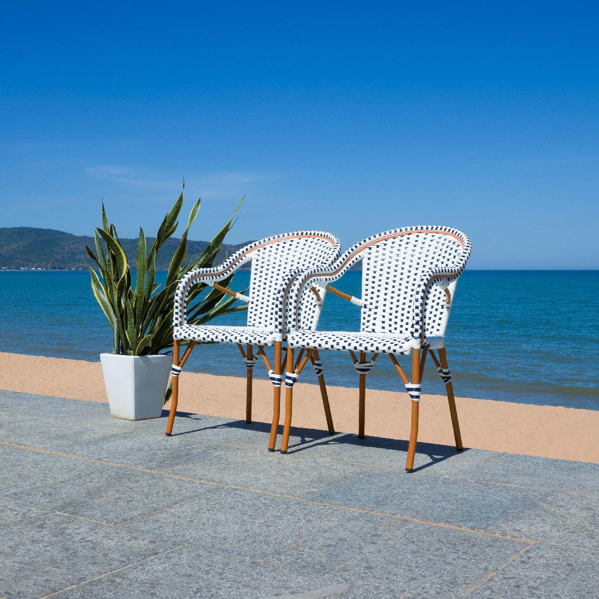 Complement Any Outdoor Space With The Breezy Charm And Warmth Of Our California Armchair. It Updates The Time-Honored French Bistro Chair With A White And Navy Color Palette. Its Woven Contours And Sheltering Arms Offer Easy Comfort. Featuring Fuax Wicker Elegantly Wrapped Around An Aluminum Frame, Our Armchair Captures Textural Beauty That Can Withstand The Effect Of Sun, Rain, And Heat. Our Lightweight And Weather-Friendly Armchair Can Serve As A Convenient, Stylish, And Comfortable Spot To Lounge Or Dine In Your Patio Or Terrace.