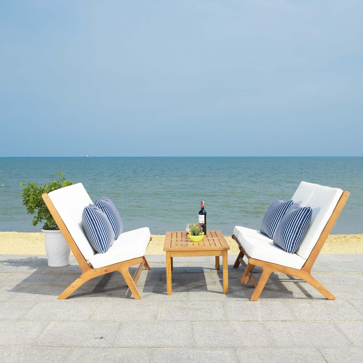 Alive with surf and sand, Sao Paulo?? legendary beaches inspired this 4 piece outdoor living set. Crafted of rich natural wood, its clean lines and plush beige upholstery is ideal for afternoon lounging by the pool. Its square pillows with thin navy stripes are complementary.