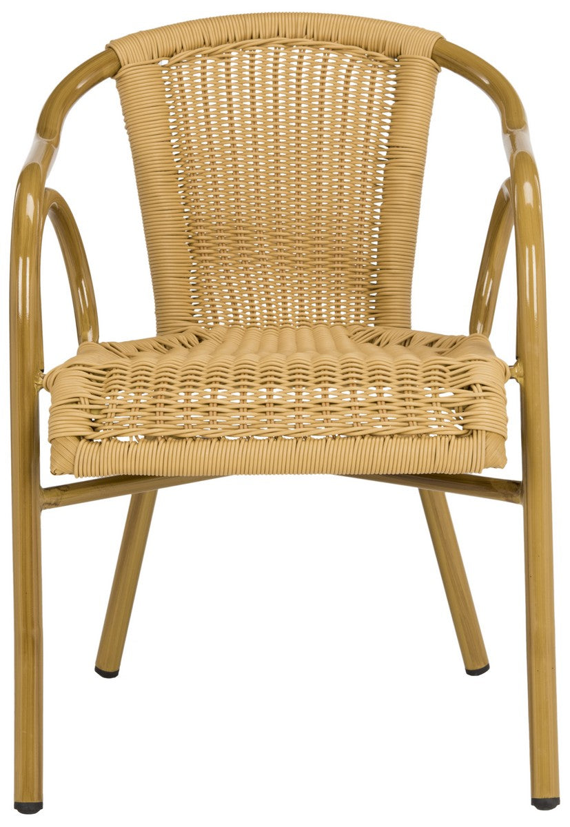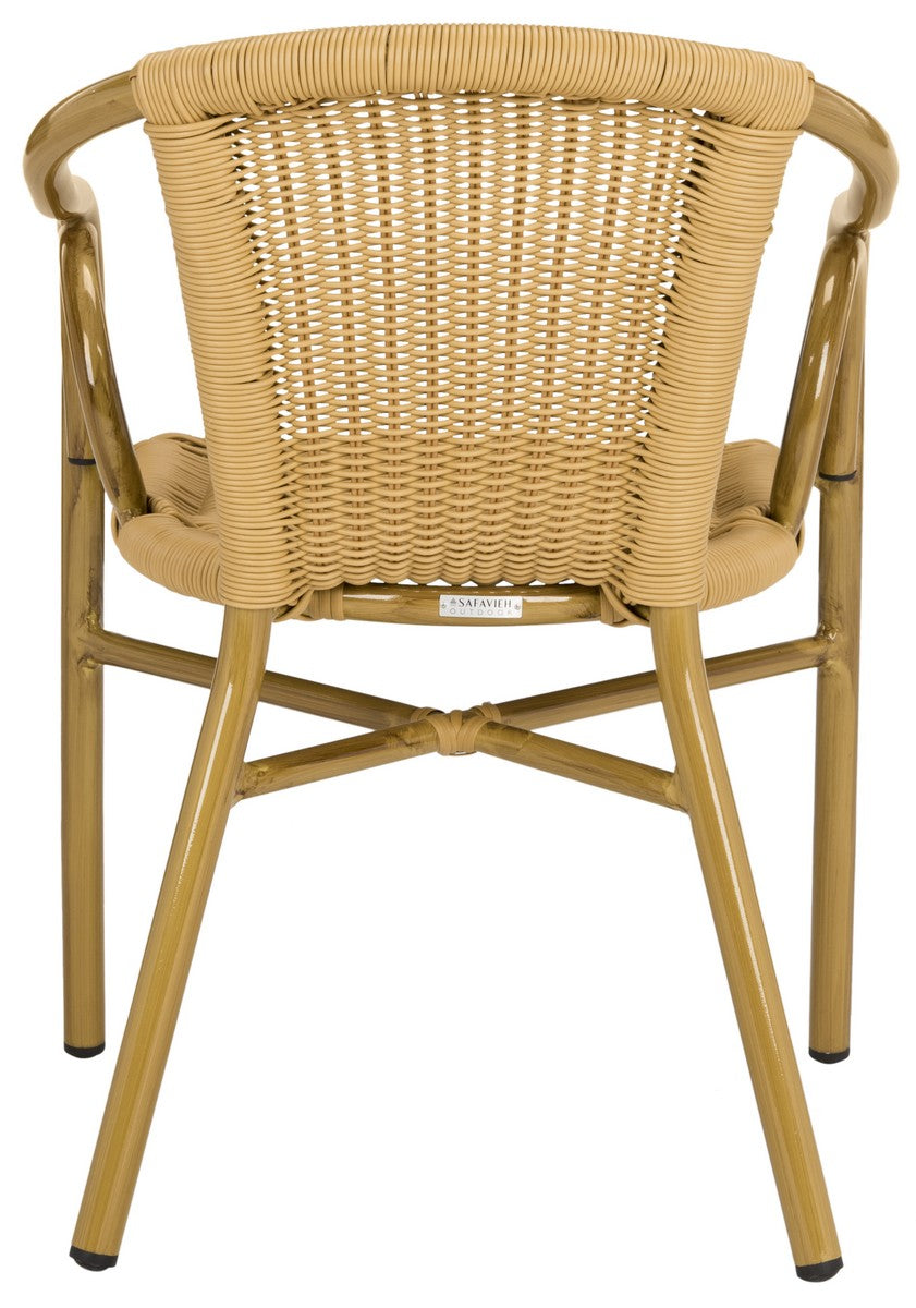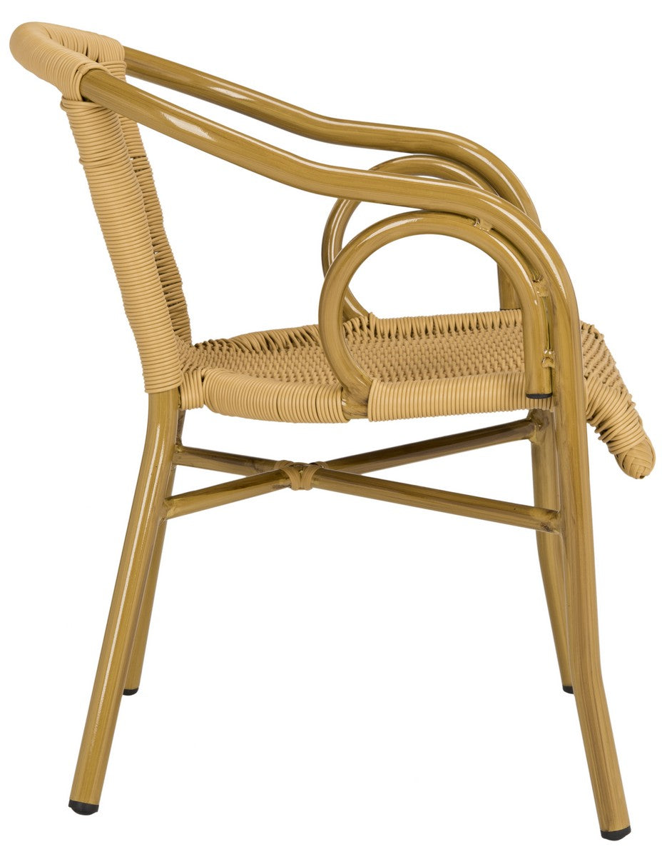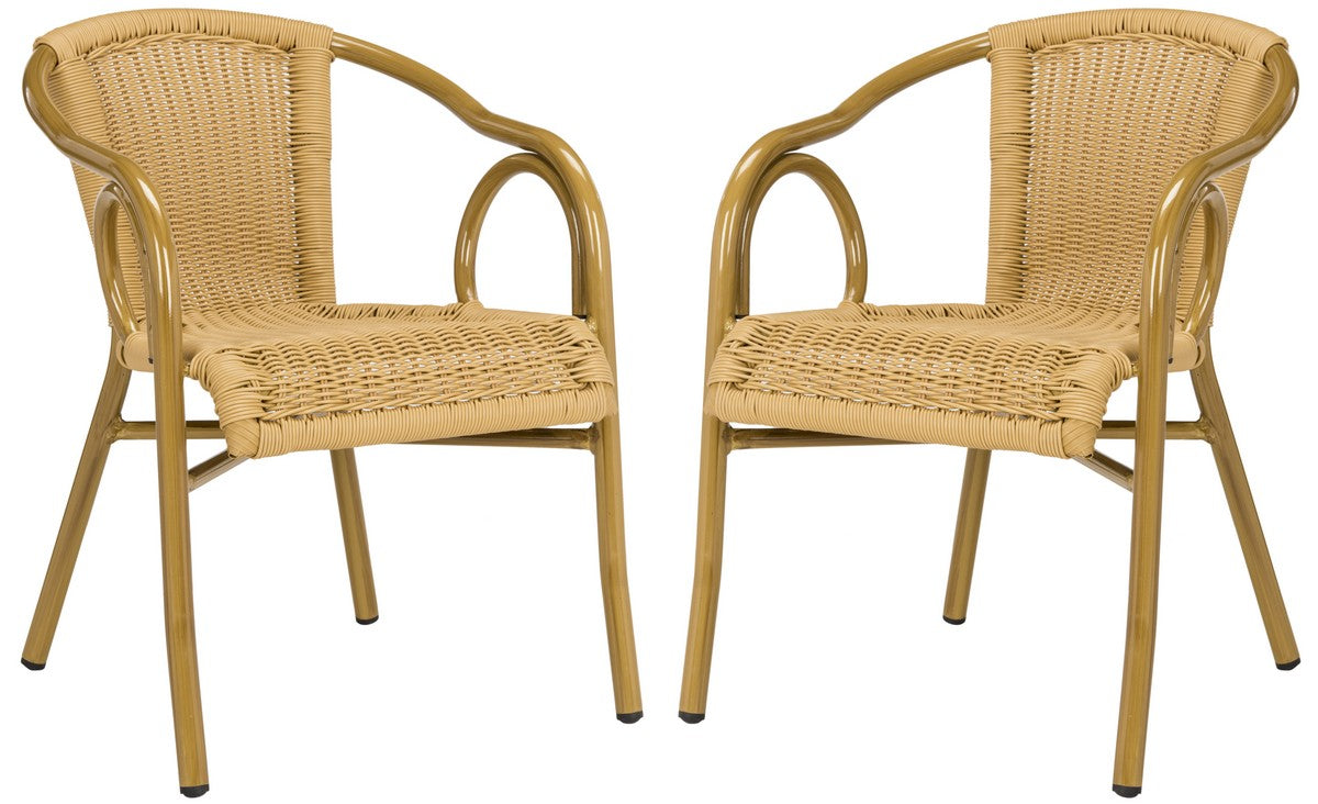 Retro chic style defines the set of two Dagny indoor outdoor arm chairs by Safavieh. With aluminum frame finished and molded to create the look of bamboo, these pretty and practical chairs feature intricate wicker seat and back in a natural hue.