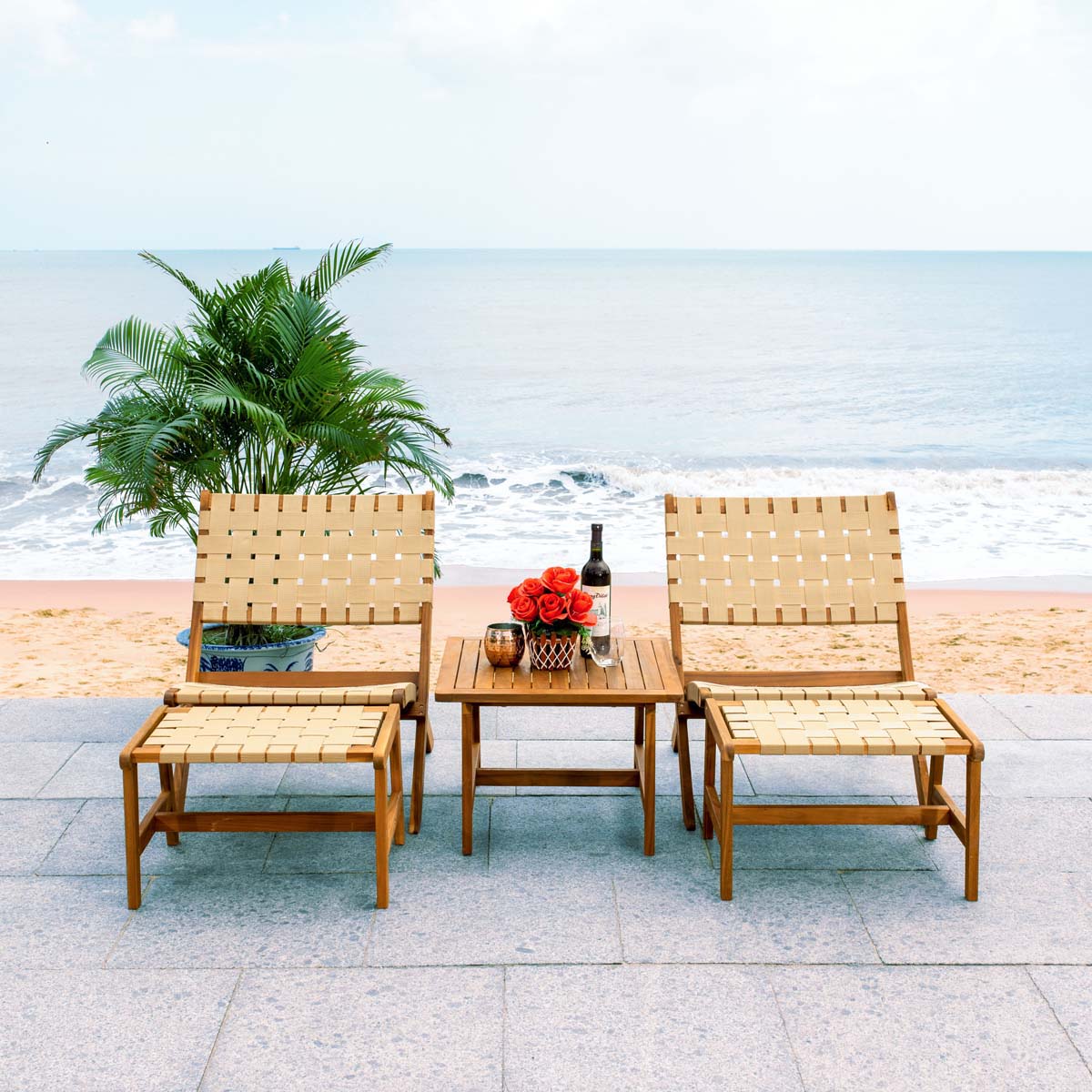 Stretch out and enjoy the summer breeze with this Darryl Set. Two natural finished acacia wood chairs and matching ottomans allow for lavish lounging in the sunshine, and an end table provides ample space for coffees, cocktails, or snacks.