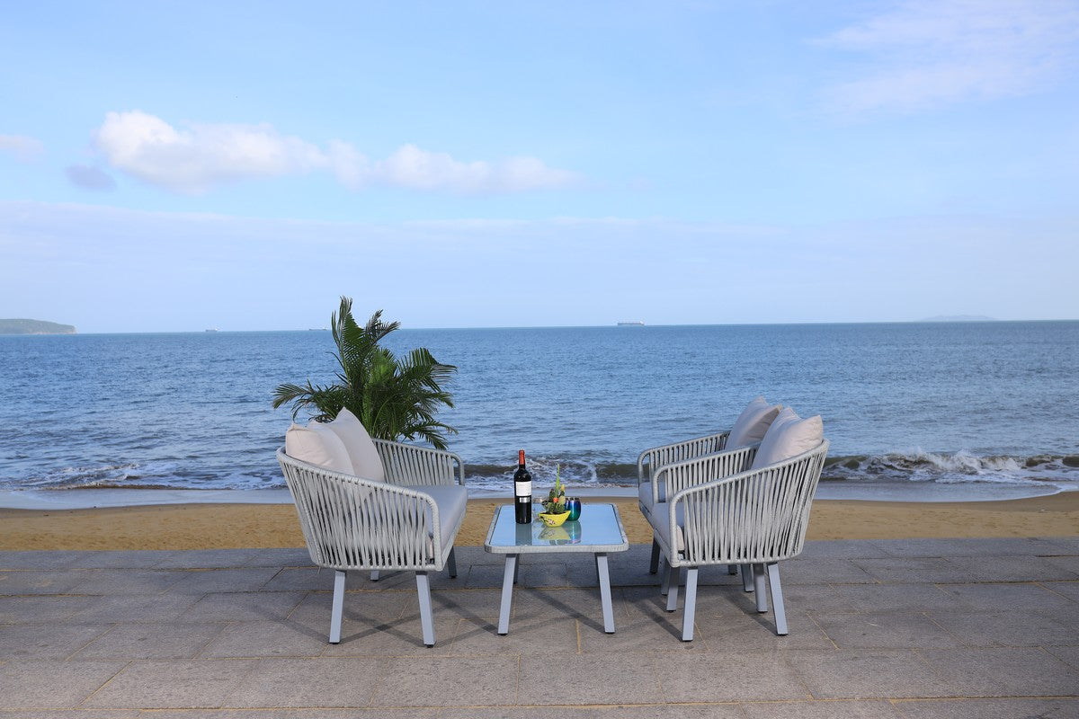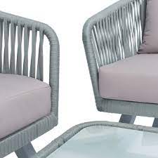 Flaunting familiar silhouettes in its two armchairs and loveseat, this Jorda 4 Piece Living Set revitalizes classic design for today?? patio or backyard d?cor. Jorda?? grey rope details beautifully mimic the airiness of the great outdoors, while its glass topped coffee table provides ample space for cocktails or canapes.