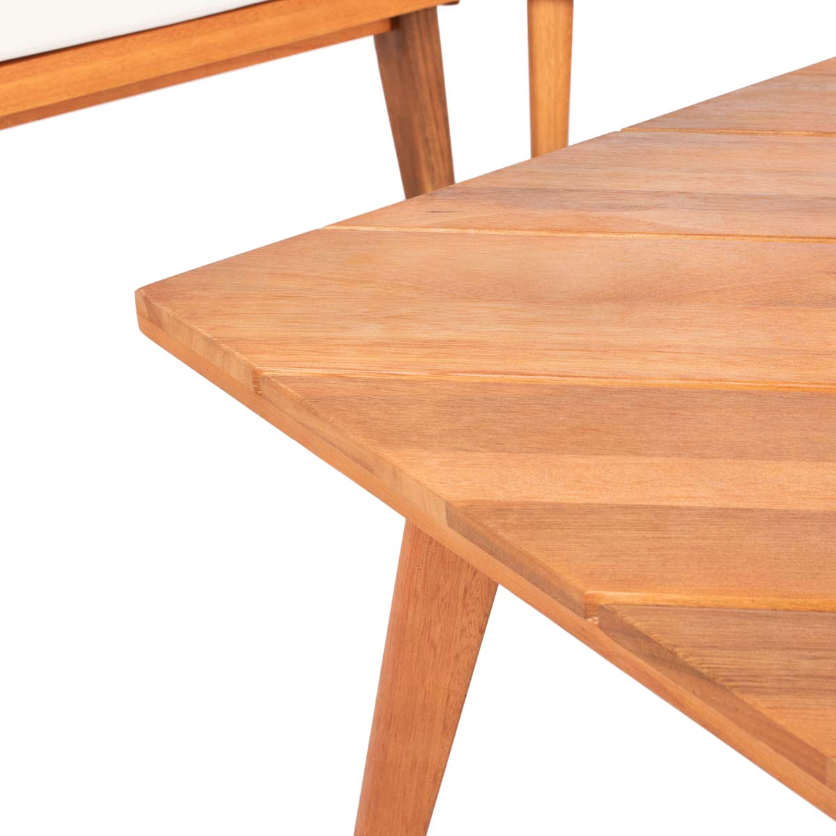 Sleek and sophisticated, this contemporary outdoor living set is a jet setter escape. This luxurious eucalyptus wood sectional sofa features built in end tables, a coffee table and comfort soft beige cushions.