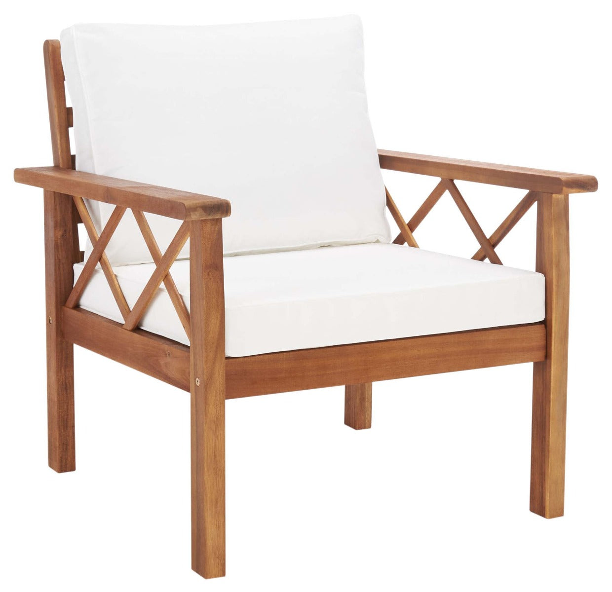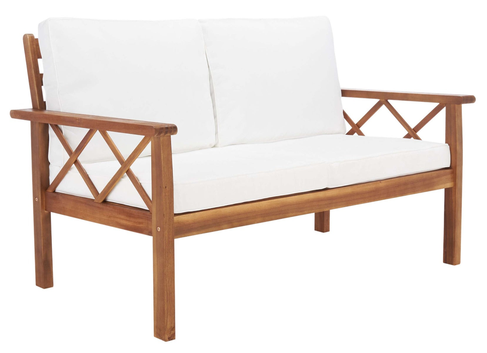 Traditional garden party furniture is given a contemporary-chic upgrade in this Loanna Outdoor Living Set. Including two armchairs, one loveseat, and one ottoman topped in plush beige upholstery as well as one accent table and one coffee table, designers are obsessed with the crossed X accents on Loanna?? natural-finished wood frames.