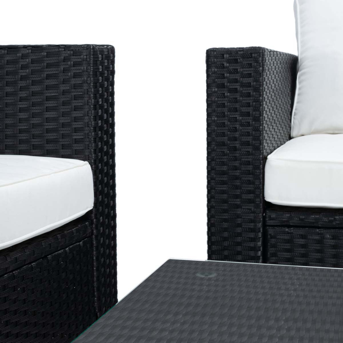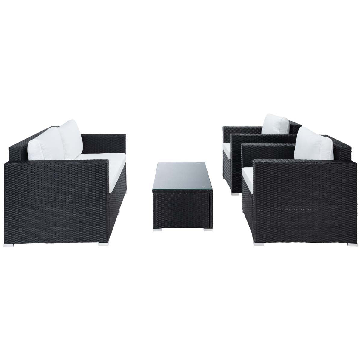 This Machie Living Set perfectly pairs clean lined geometry with rich, flowing texture, elevating your outdoor d?cor to new heights of sophistication. Machie?? black woven frames are beautifully juxtaposed with plush beige cushions, and its glass topped coffee table provides ample room for drinks or tapas.