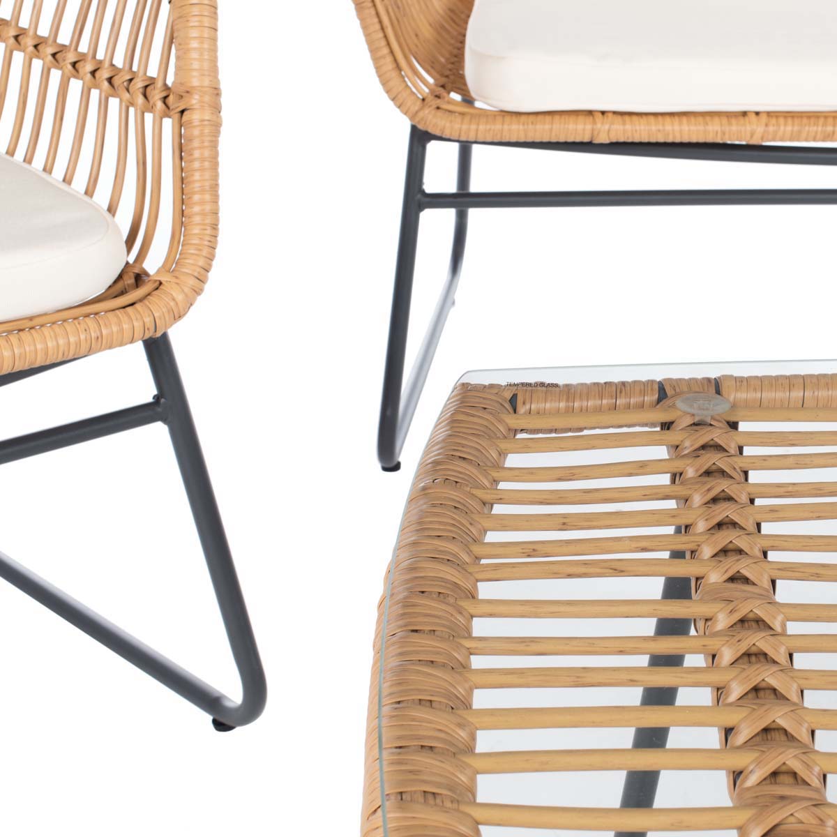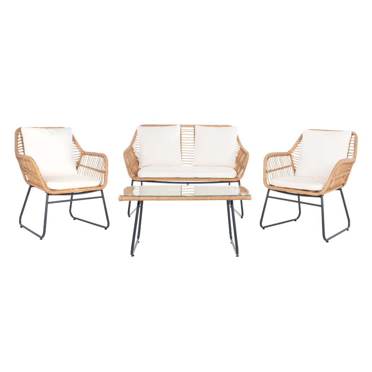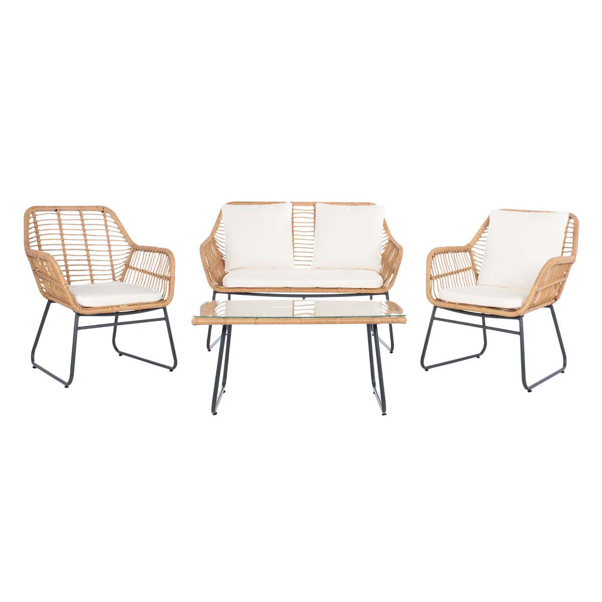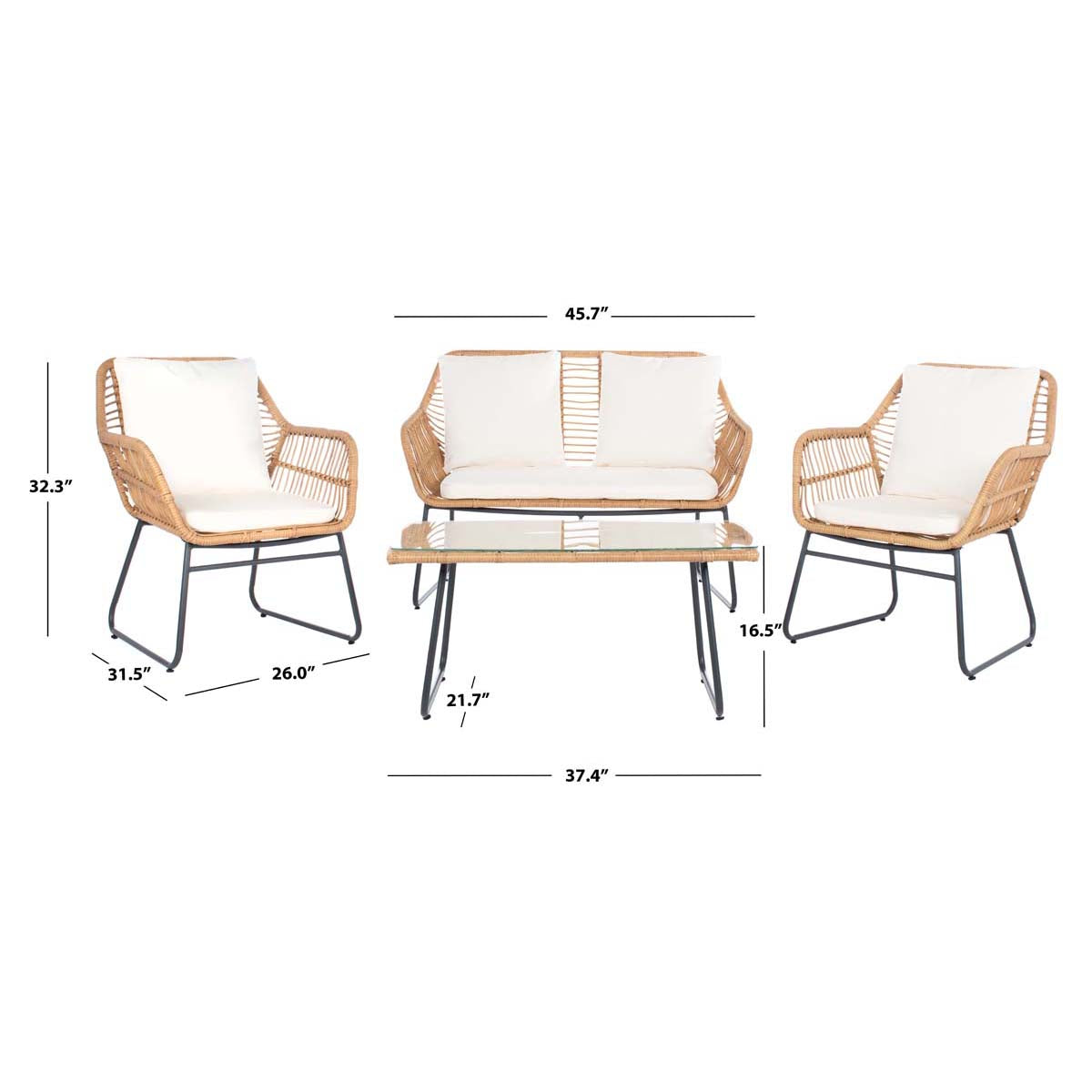 Indulge in the leisurely lifestyle with the Roston 4 PC Living Set. Woven rattan chairs, loveseat and cocktail table lend an airy look to outdoor spaces, making this retro mod set an ideal choice for the backyard deck, patio or covered porch.