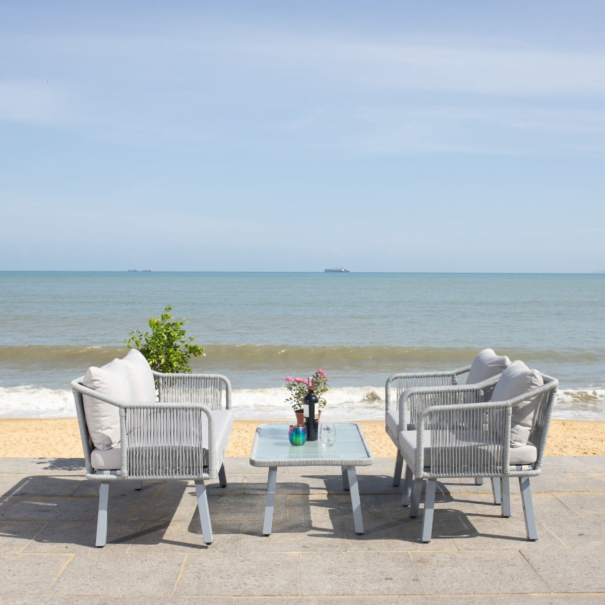 Modern minimalism gets a contemporary chic upgrade in this Torsla 4 Piece Outdoor Living Set. The geometric frames of Torsla?? two chairs and loveseat are given a delightful, airy touch with grey rope details, while matching grey cushions provide plush comfort in the great outdoors. Includes a glass topped coffee table.