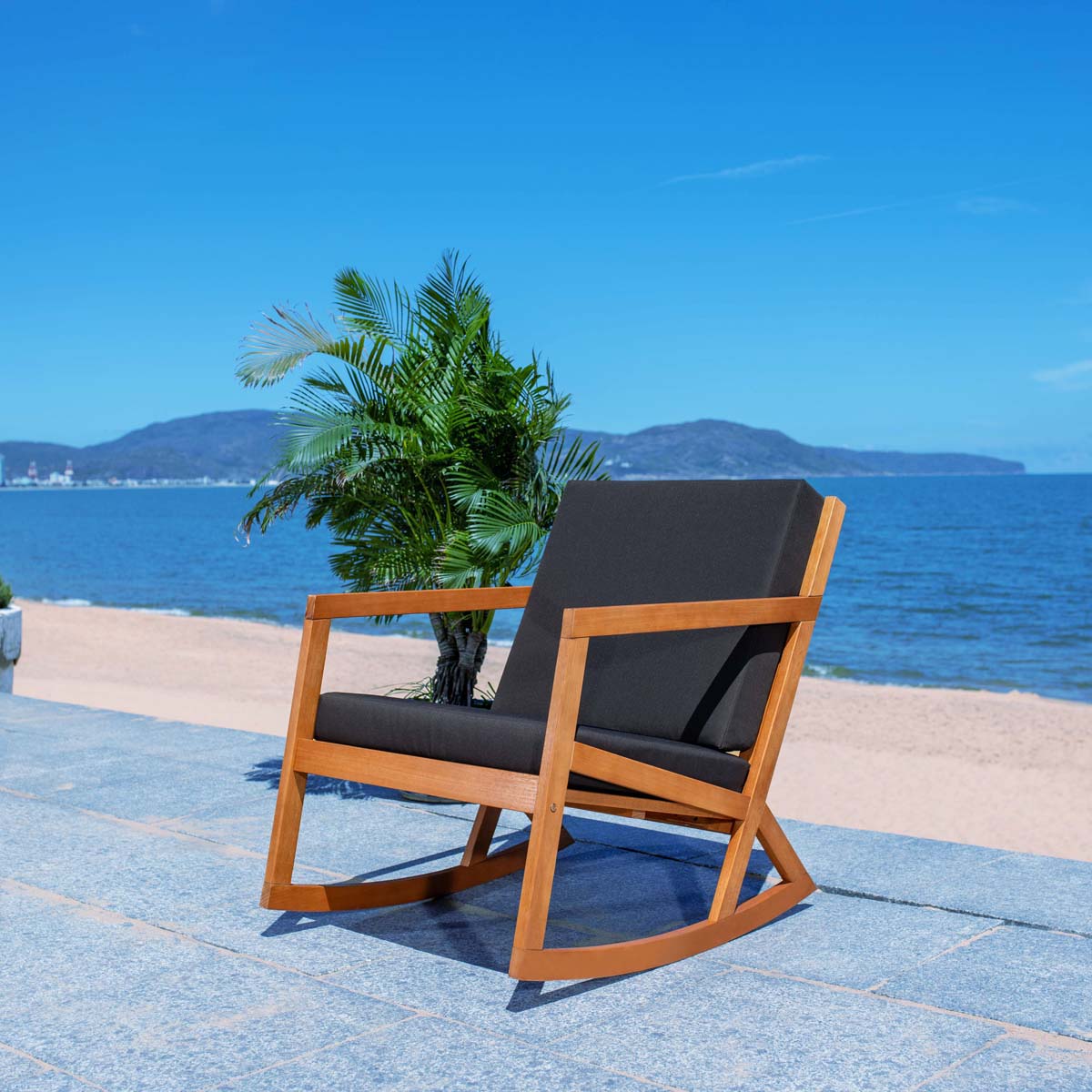 Contemporary with a nod to hand crafted Shaker individuality, this elegant outdoor rocking chair is destined to become a new American classic. Made from eco friendly eucalyptus wood in natural finish, it comes with easy care front and back cushions.