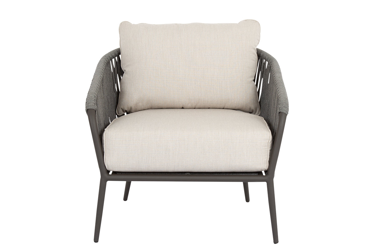 Featuring an extra wide seat, the Florence chair exemplifies comfort with deep seat and pillow back cushion. Wrapped by hand with a flat all weather rope on a curved bucket frame and tapered legs.