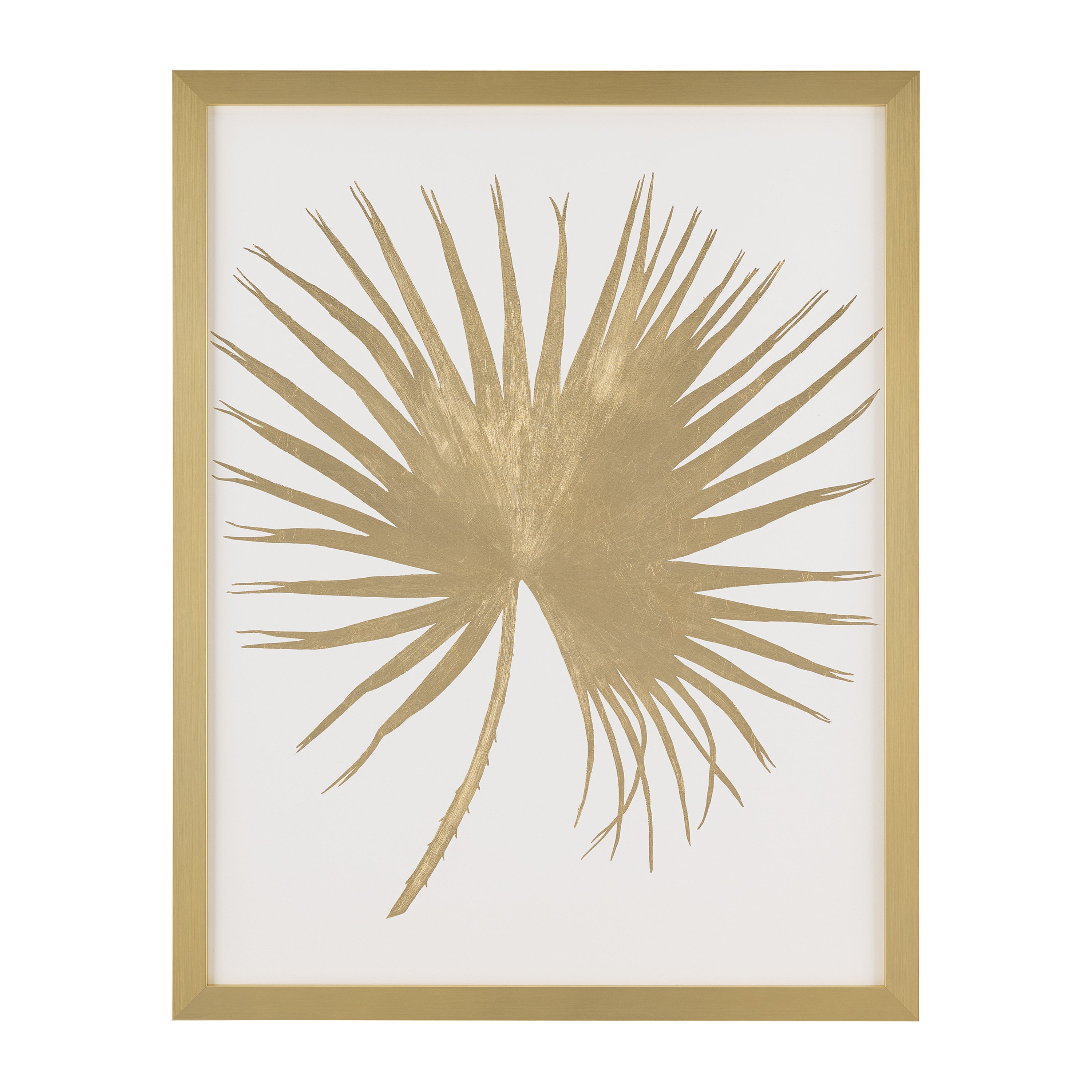 Golden Palms by artist Annie Moran masterfully blends gorgeous florals with luxurious tones. The piece depicts gorgeous palm leaves on watercolor paper in hand-applied gold leaf. The artwork is held within a matching gold gallery frame, and may be displayed from a vertical or horizontal orientation.
