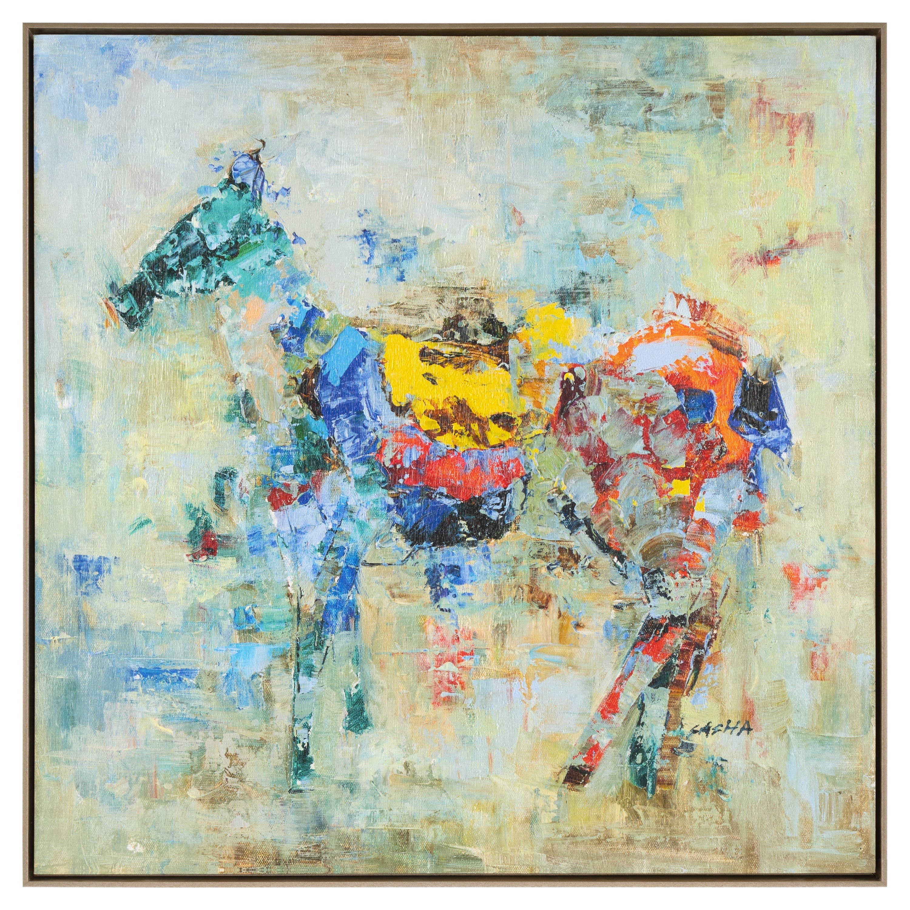 Equestrian Confetti is a whimsical giclee print on canvas that portrays an abstract horse that showcases bold colors elevated by a heavy matte gel. This stunning work of art is held within a Champagne gallery frame.