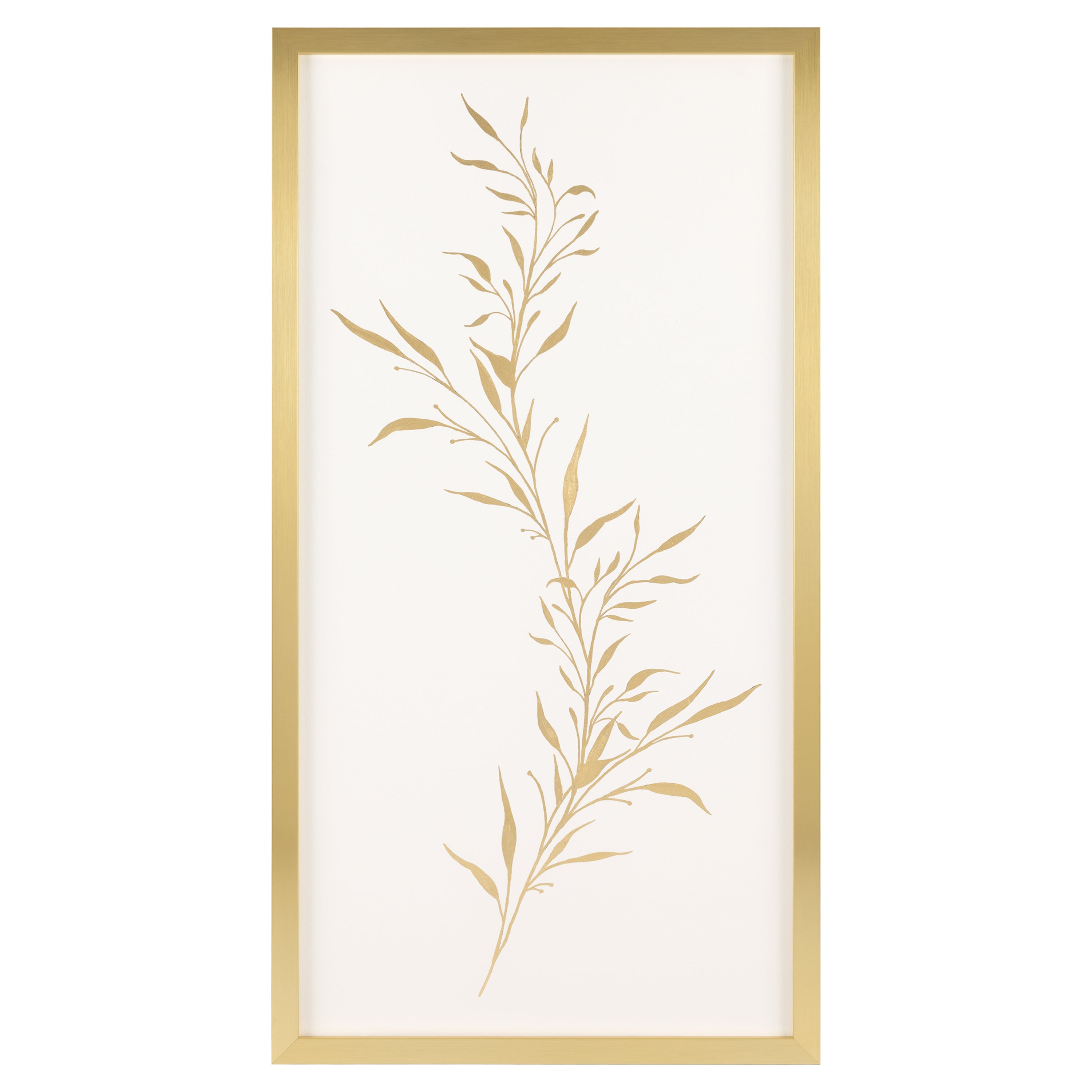 Golden Vines is a stunning in-house creation on watercolor paper that showcases a delicate floral motif in hand-applied gold leaf. The artwork is held within a gold gallery frame and may be displayed in both vertical and horizontal orientations.