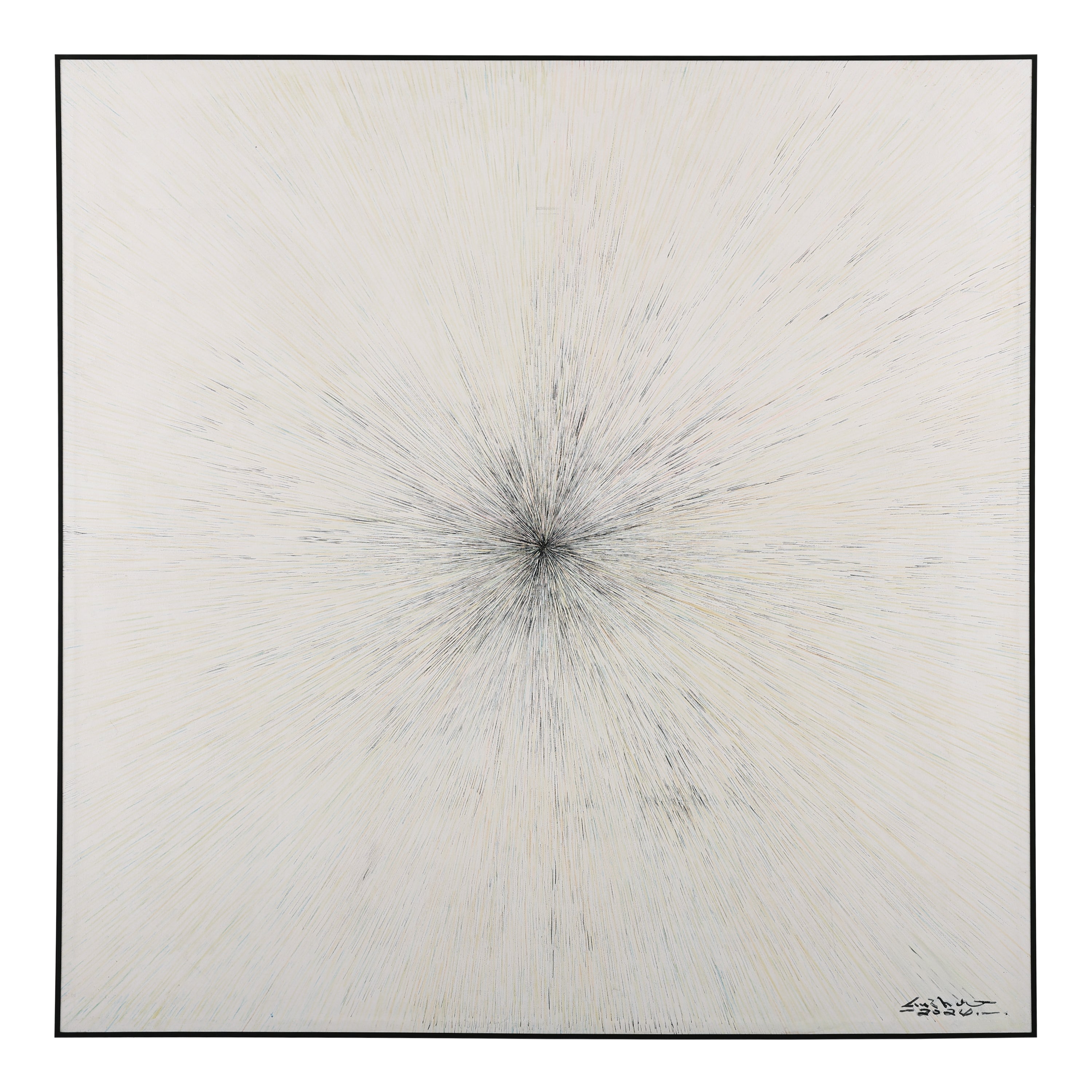 Light Speed is a stunning oil painting on canvas that evokes the look of faster than light travel, infusing an irresistible sense of motion to an interior space. The white backdrop highlights a cluster of black lines originating from the center as they scatter outwards into an explosion of multicolored hues. The artwork is held within a black aluminum gallery frame and may only be displayed in a vertical orientation.
