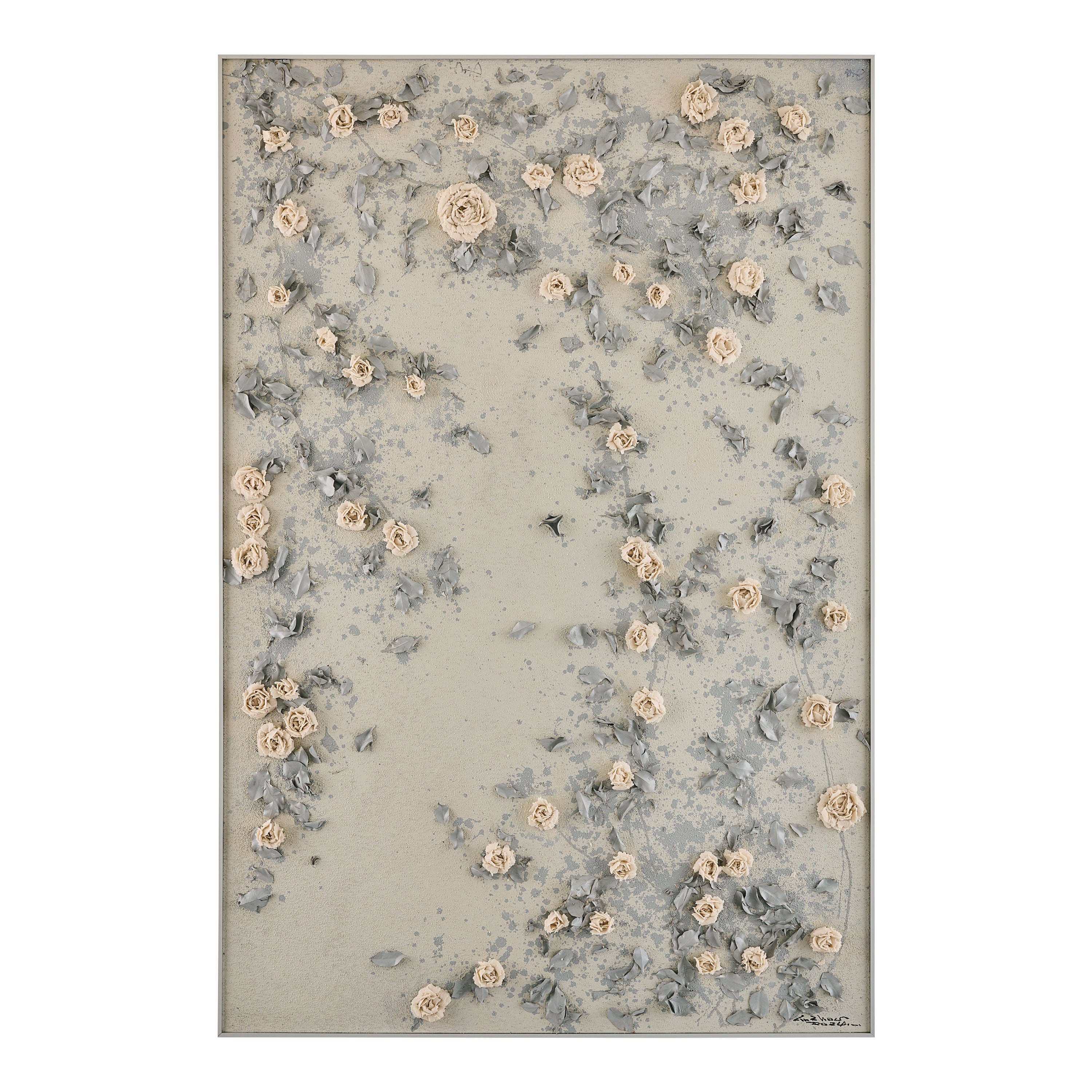 Hanging Rose Garden by artist LM Zhou is a dimensional piece showcasing a gorgeous display of roses and hand-painted leaves on canvas. The pristine white tones paired with splashes of gray lend a tasteful sophistication to a space. The piece is held within a silver aluminum gallery frame and may only be displayed from a vertical orientation.