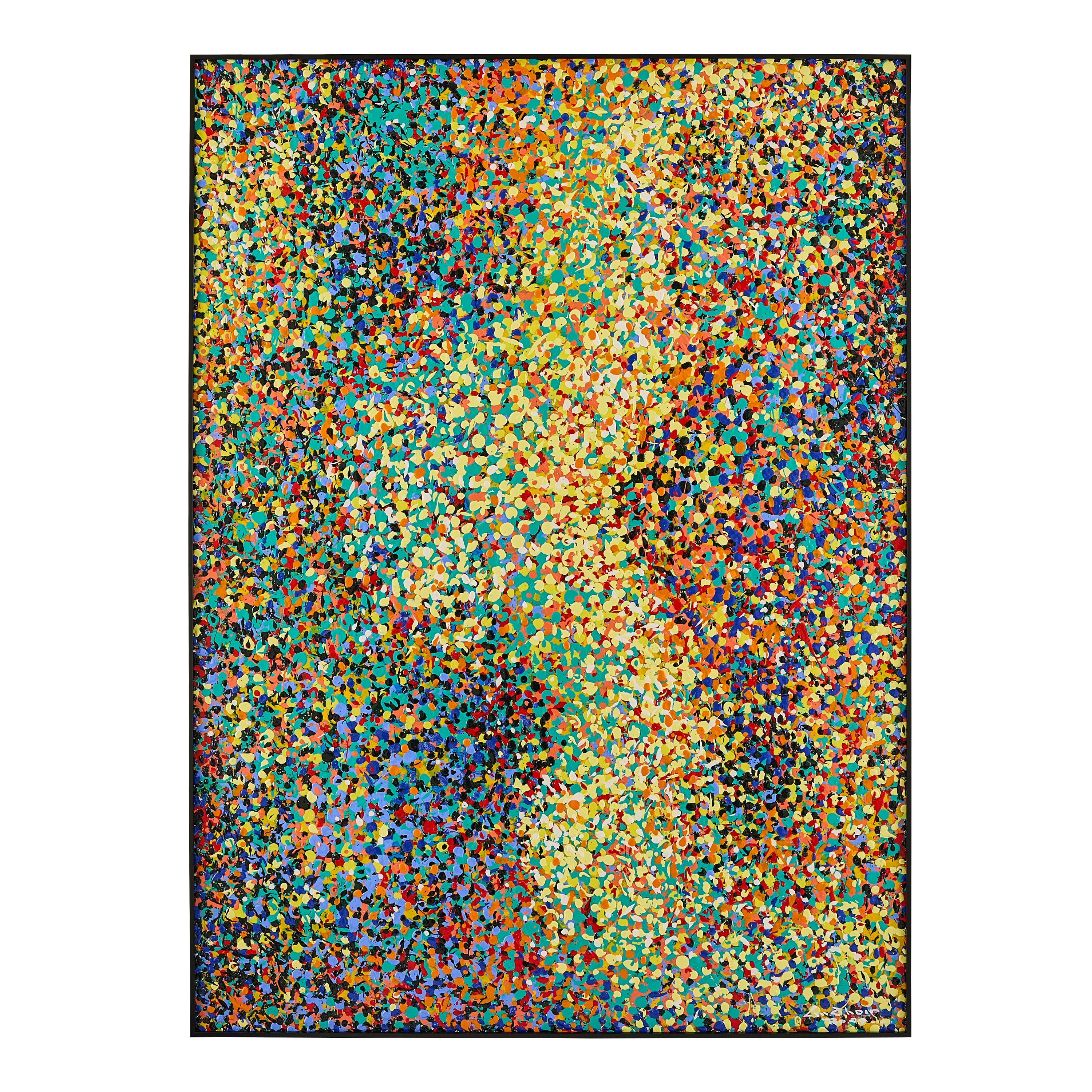 Vibrant Pointillism by artist LM Zhou is a vivid design statement realized in acrylic paint on canvas. The artwork demonstrates a masterful command of the pointillism technique, creating a richly textured, mosaic-like display of color and pigment. This stylish piece is held within a black aluminum gallery frame and may only be displayed from a vertical orientation.
