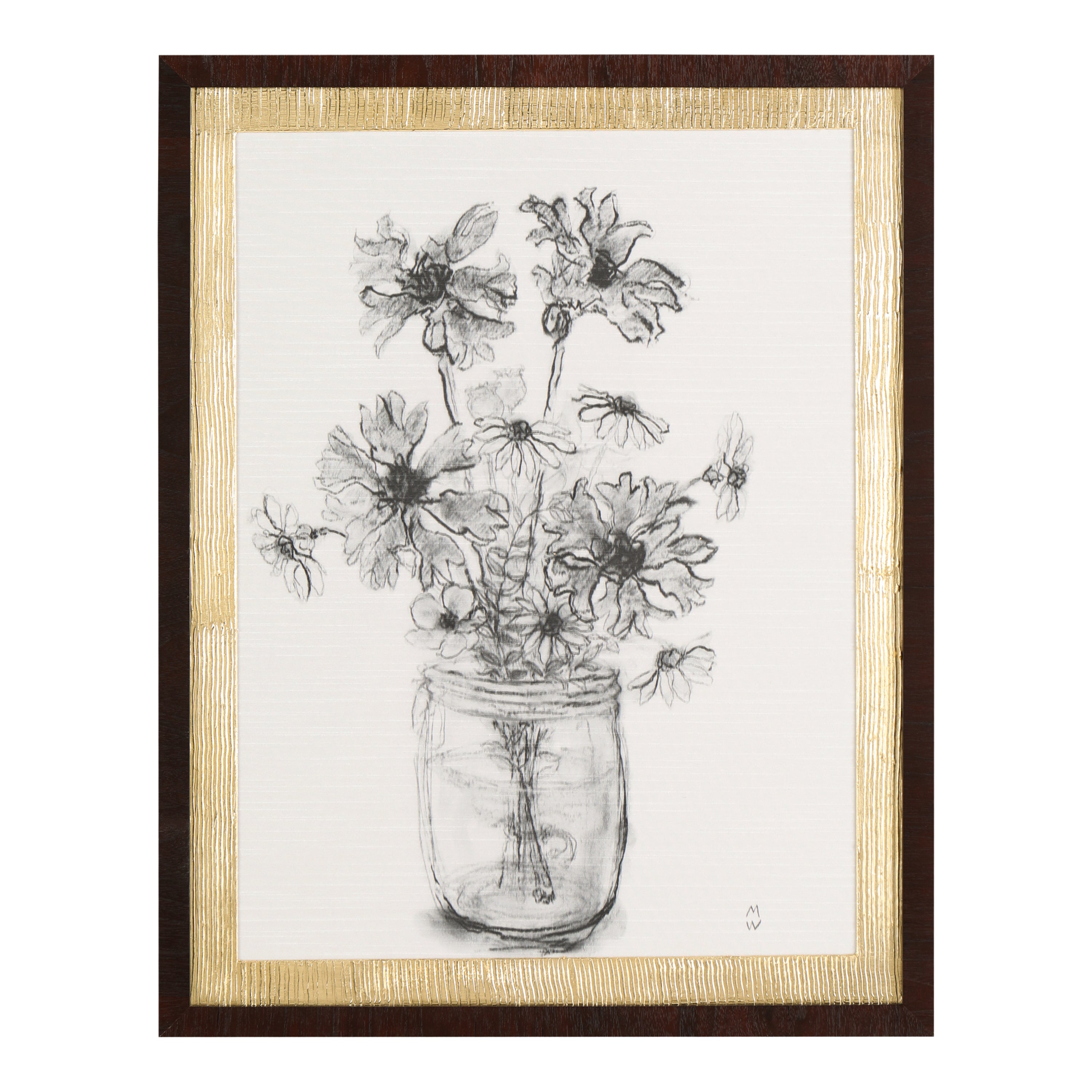 Shine by artist Manny Woodard is printed on silk in black and white, depicting a mason jar with delicate flowers. Hand-applied gold leaf texturing imbues the piece with ornate tones and textural depth. The artwork is displayed under glass within a mahogany gallery frame.