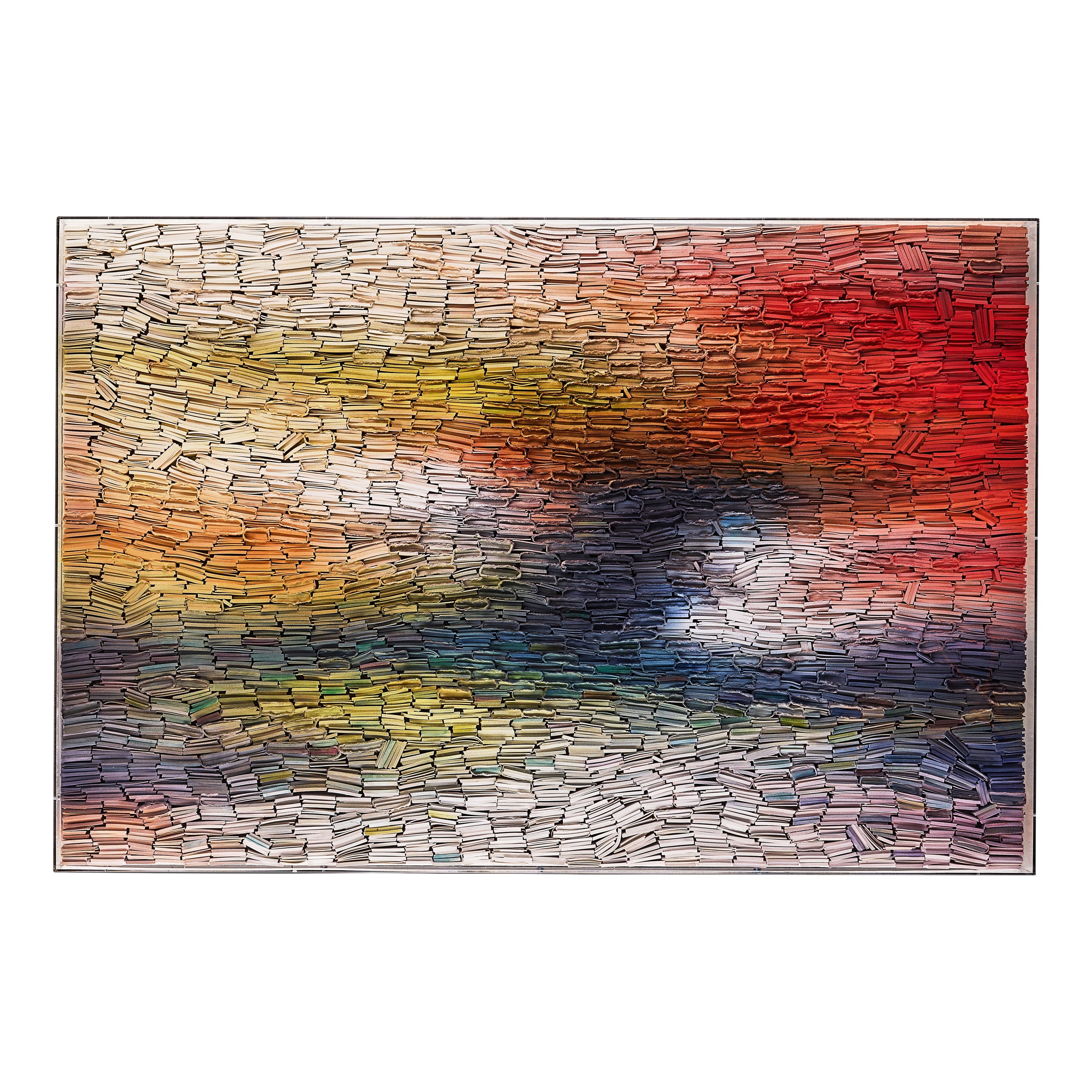 Drifting Echoes by Tony Fey is a contemplative piece crafted from vinyl on canvas. Seductive shades of red, blue, pink, white, and yellow blend and intermingle to create a gorgeous textural display in any space. The hand-made artwork is held within a clear acrylic frame and may only be displayed from a horizontal position.