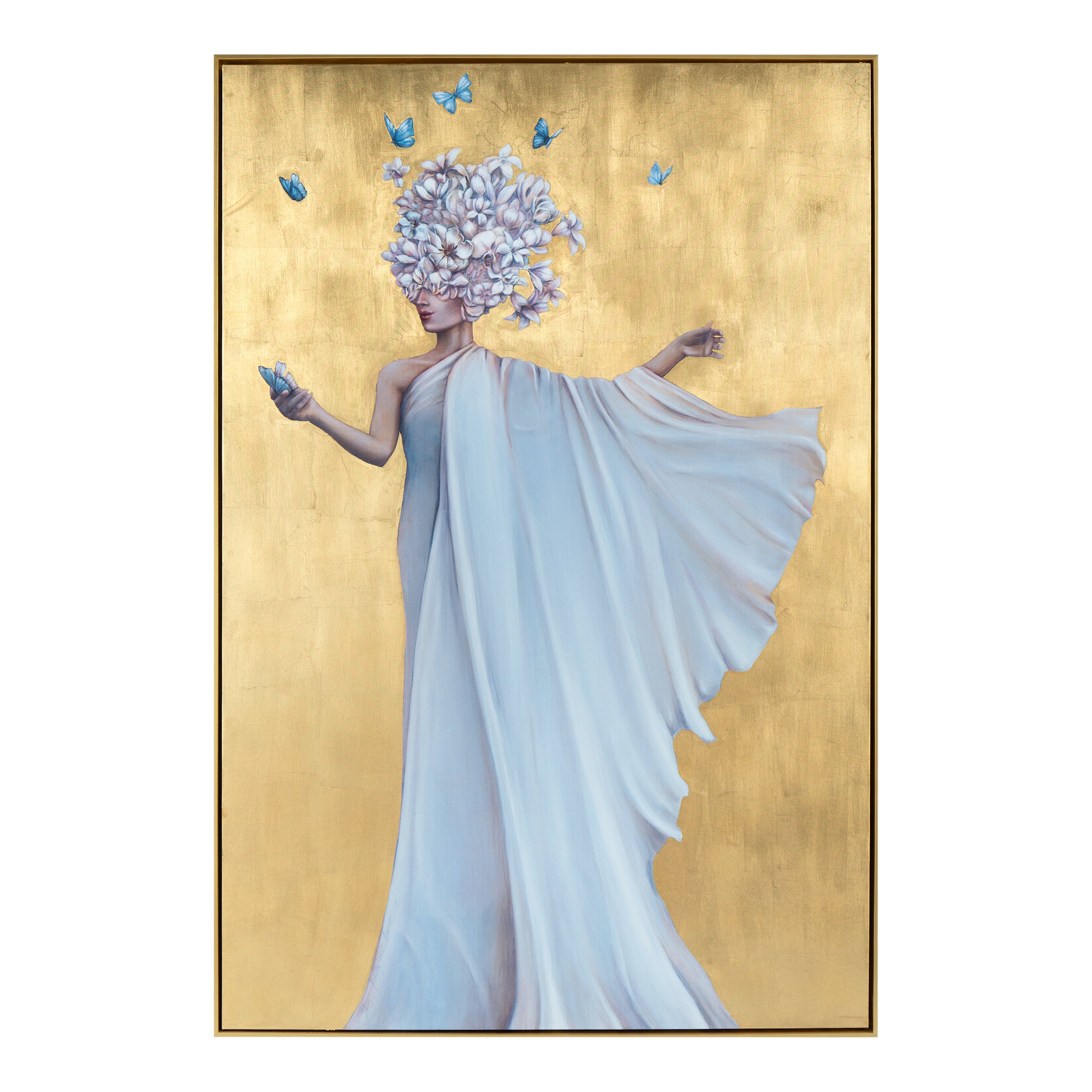 Golden Hour by artist Zana Brown showcases a spectacular human figure in a glistening ivory dress, accentuated by a stunning Gold Leaf background. Vivid flora and butterflies in a soft blue tone further elevate this elegant work of art. The beautiful piece on canvas is displayed from within a gold floater frame.