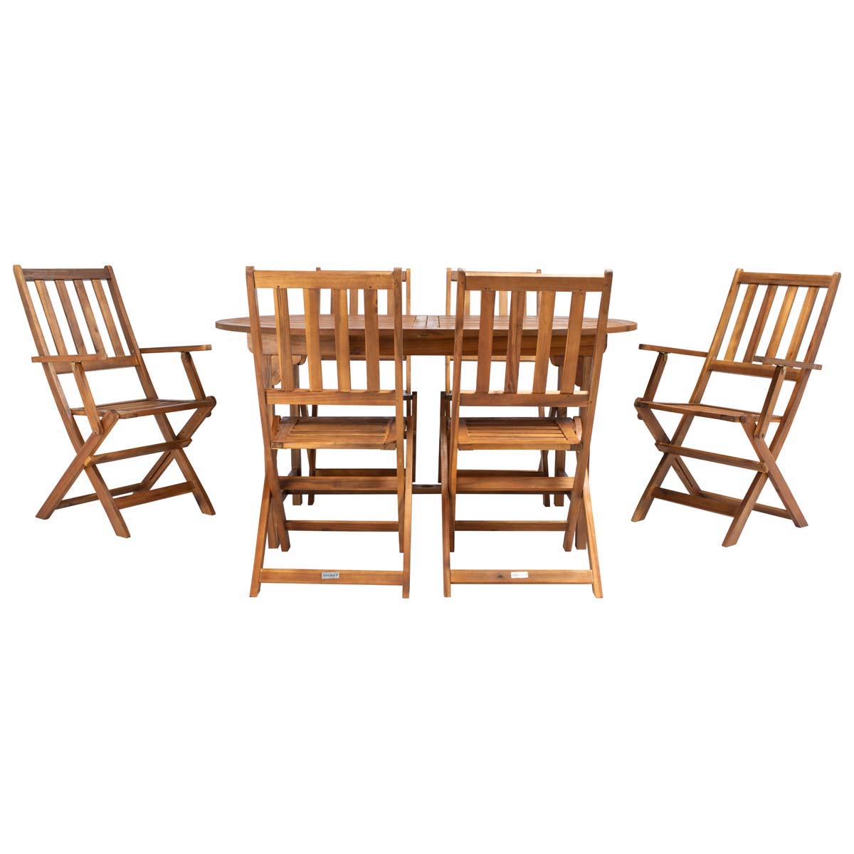 Rustic yet refined, this Hikaru Dining Set gives a country cottage touch to contemporary outdoor entertaining. Hikaru includes six dining chairs and one oval dining table in rich natural acacia wood, featuring an opening for an umbrella to keep you shaded from the sun's harsh rays as you dine with friends.